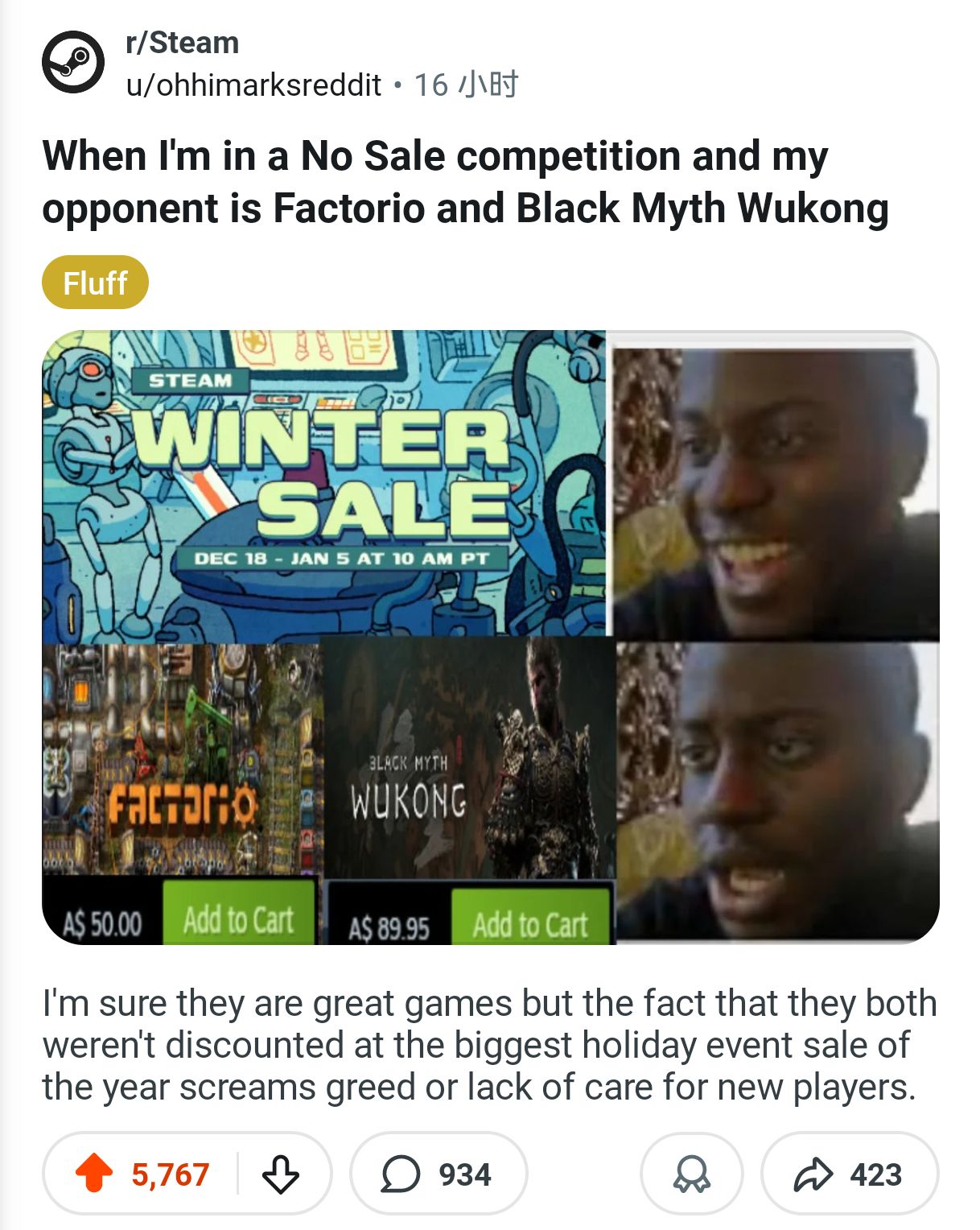 在Reddit上,某位想玩黑神话的游戏玩家在社区上抱怨“在一年最大的折扣活动中,黑神话和异星工厂居然没有一点折扣!”