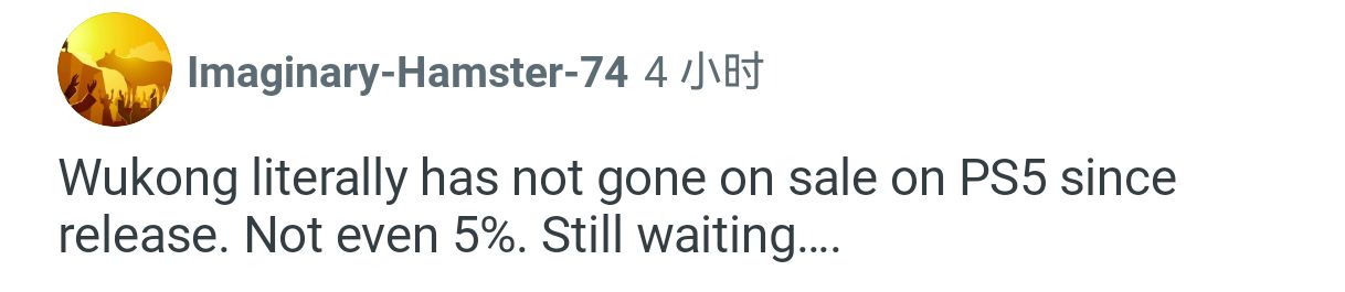 自发布以来,《黑神话:悟空》在PS5上真的一次都没打过折。连5%都没有!还在等待中……