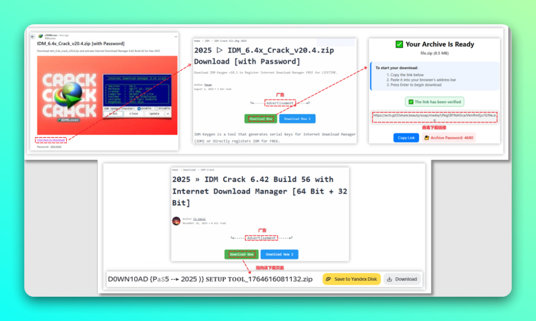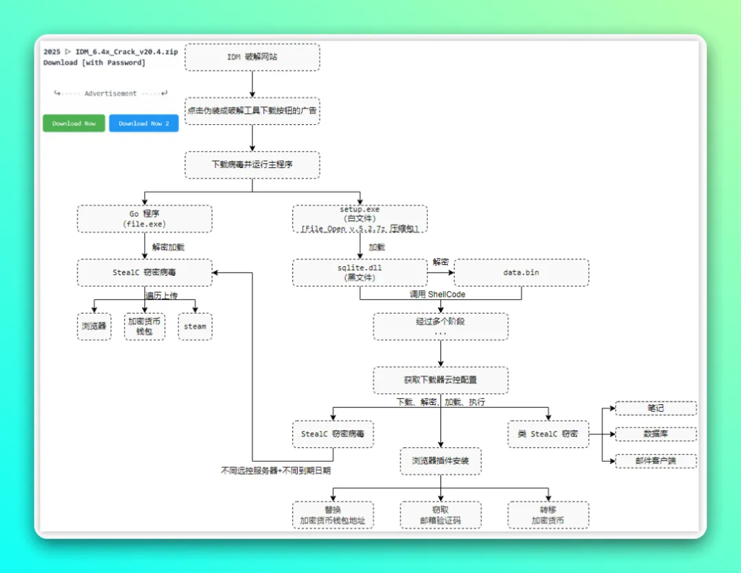 众多用户寻求的 "IDM 破解程序" 下载网站中,显眼广告位被植入恶意下载按钮,点击后会触发 StealC 窃密病毒及同类变种程序。