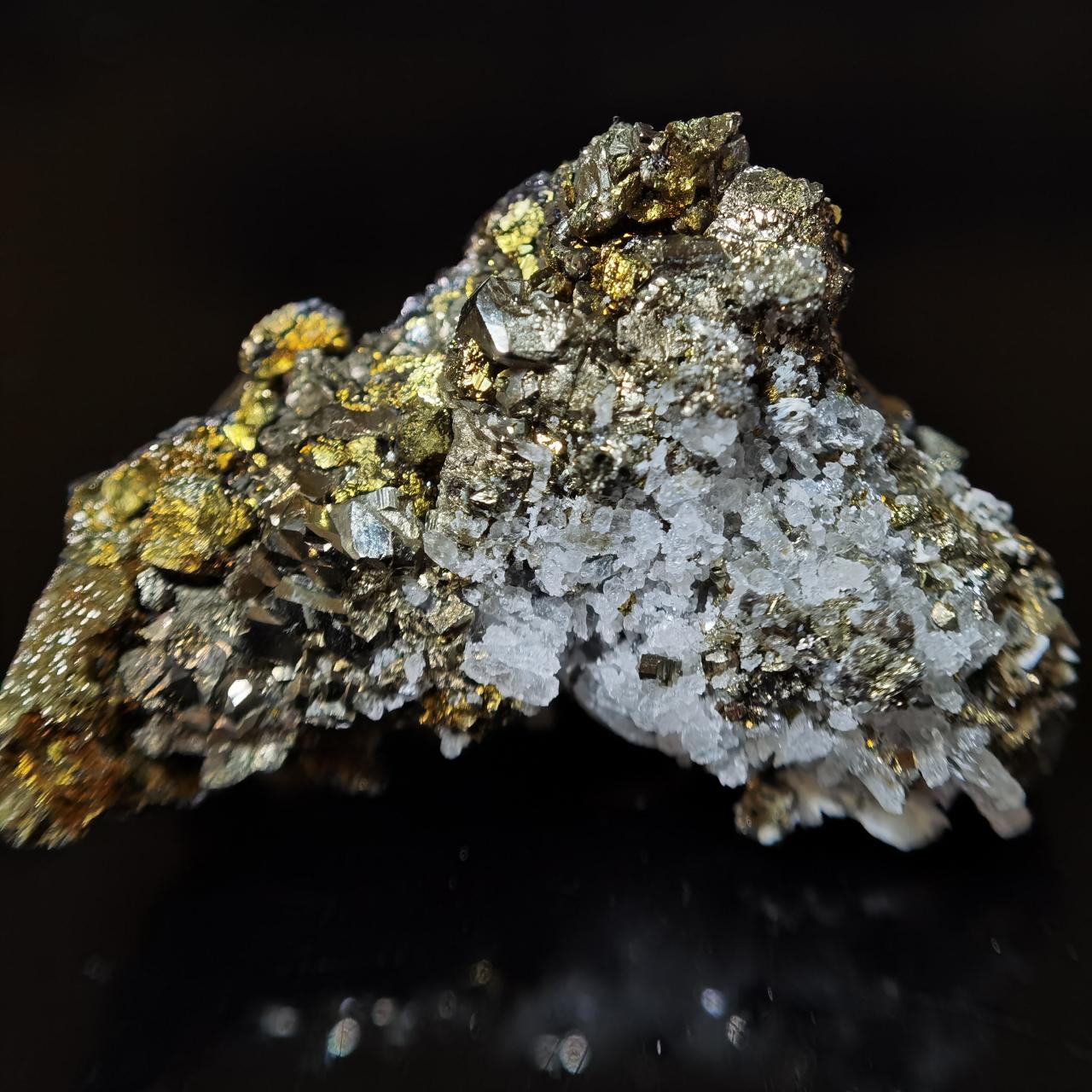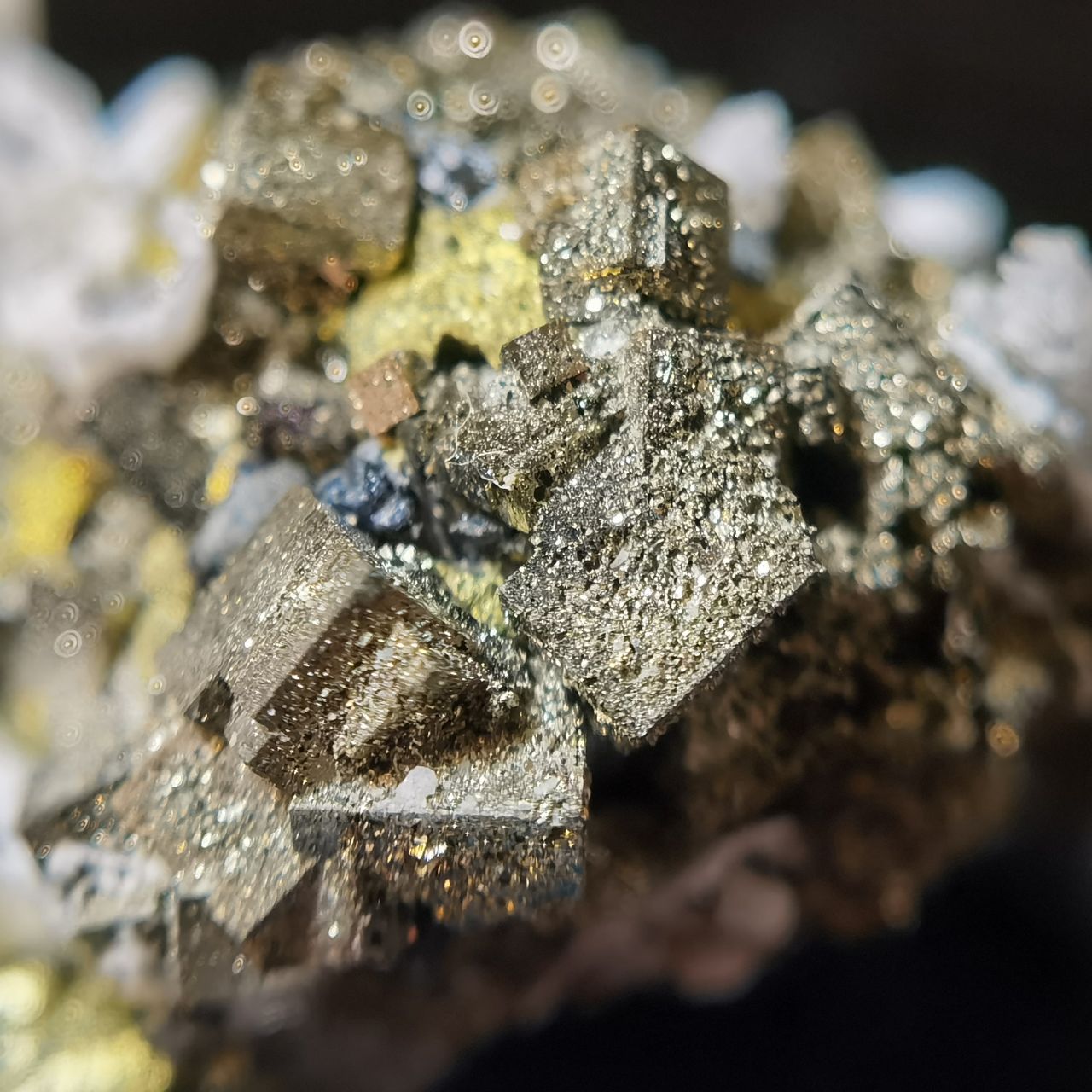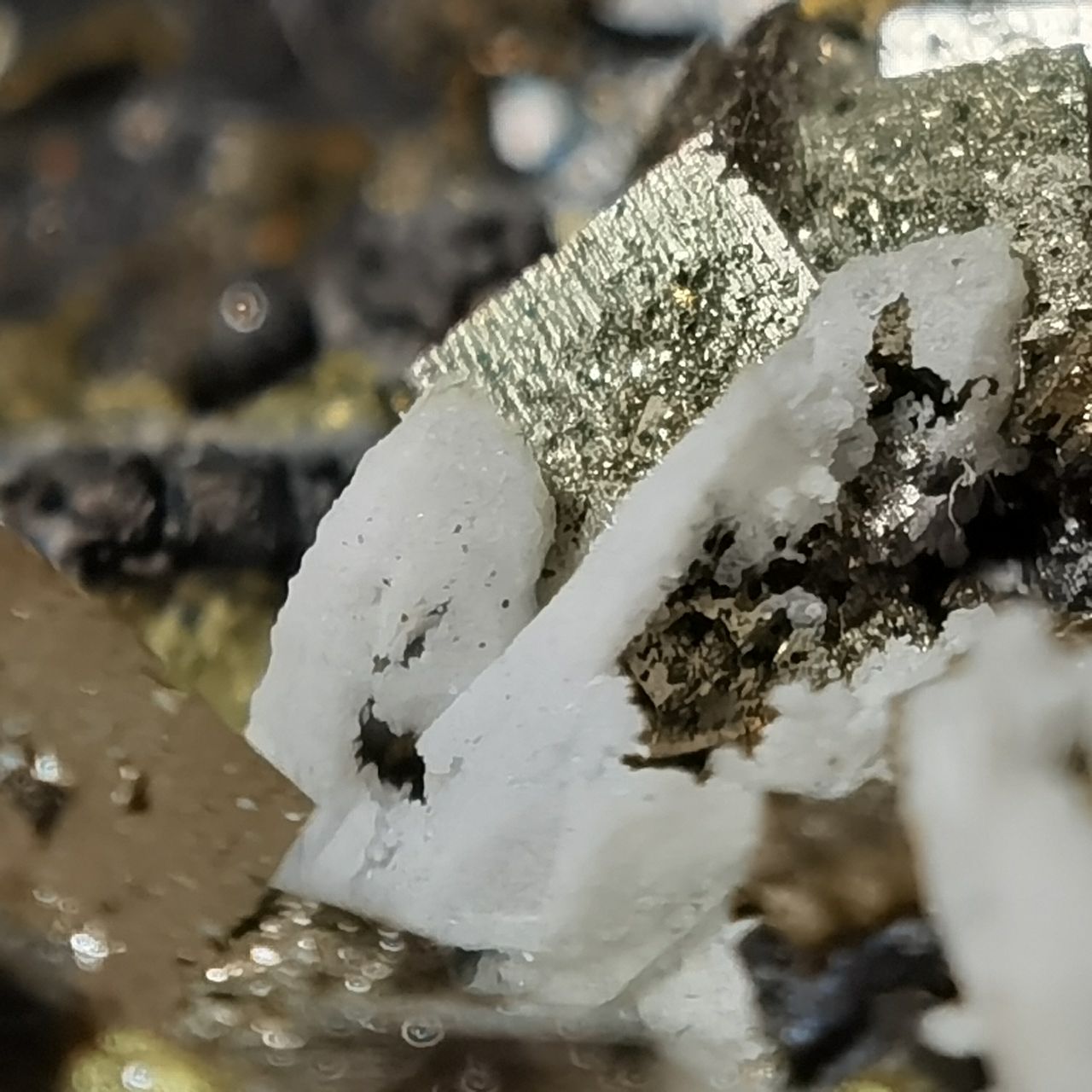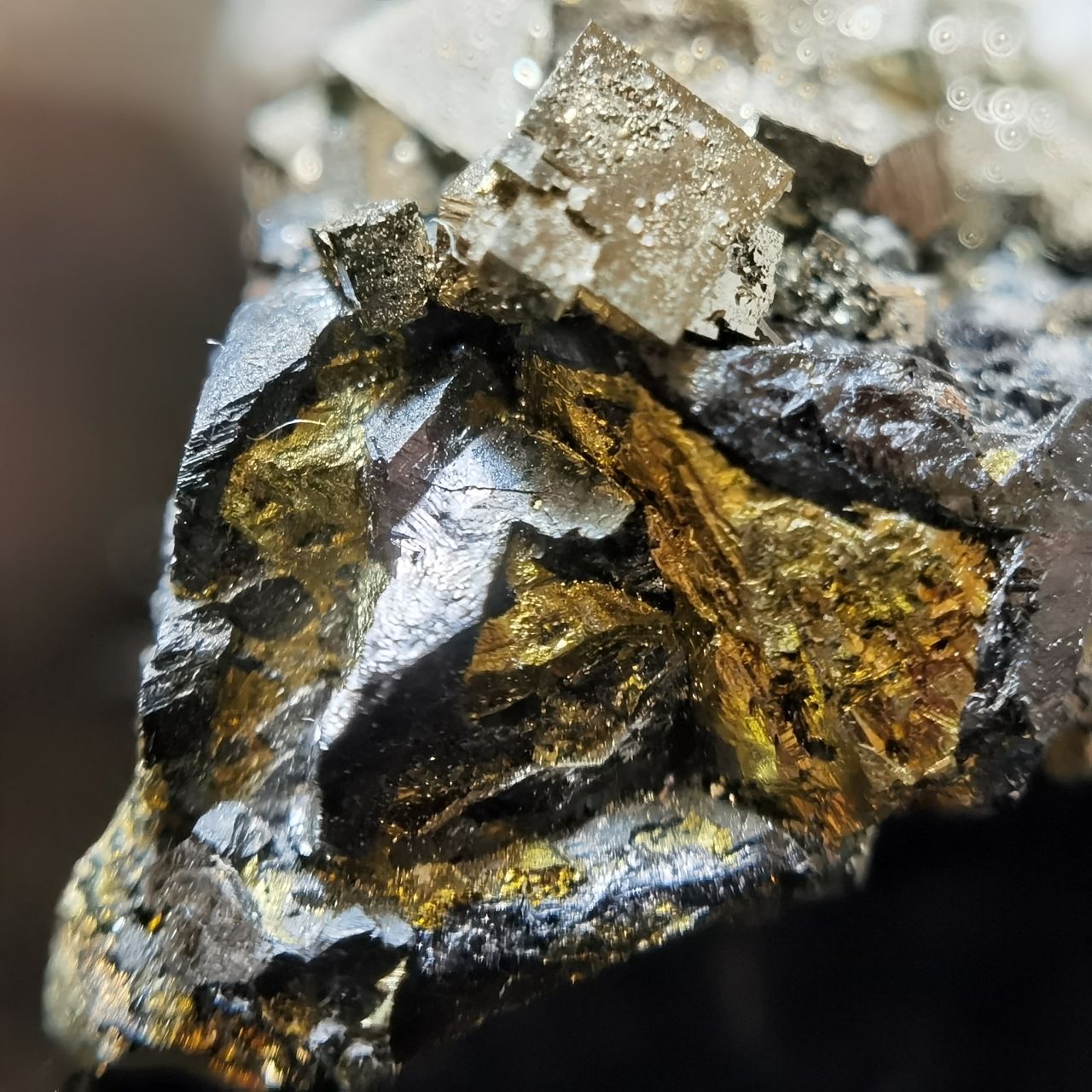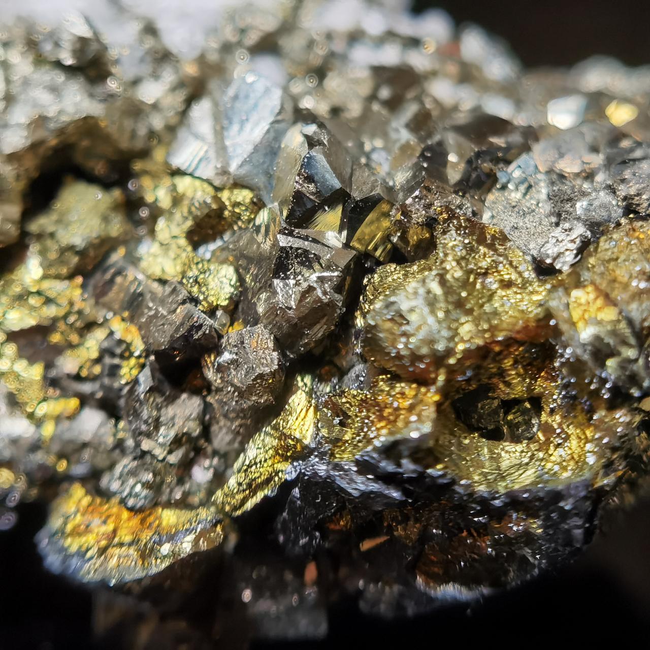 黃鐵礦閃閃發亮但表面坑坑窪窪的實際上是表面的小結晶生長丘以及蝕坑,不清楚是否與矽卡巖礦牀相關,大家如果想看黃鐵礦我這裏也有更好的。黃銅和閃鋅沒啥好介紹的,寫這塊標本主要原因是觀察到了非常奇特的現象