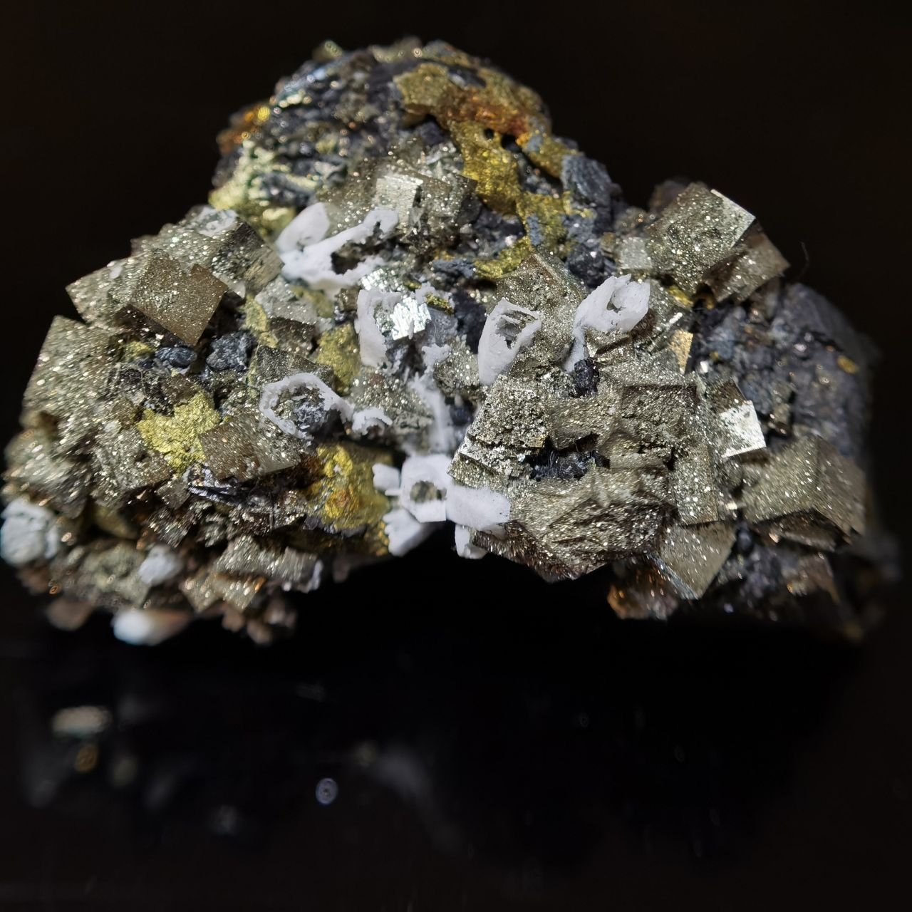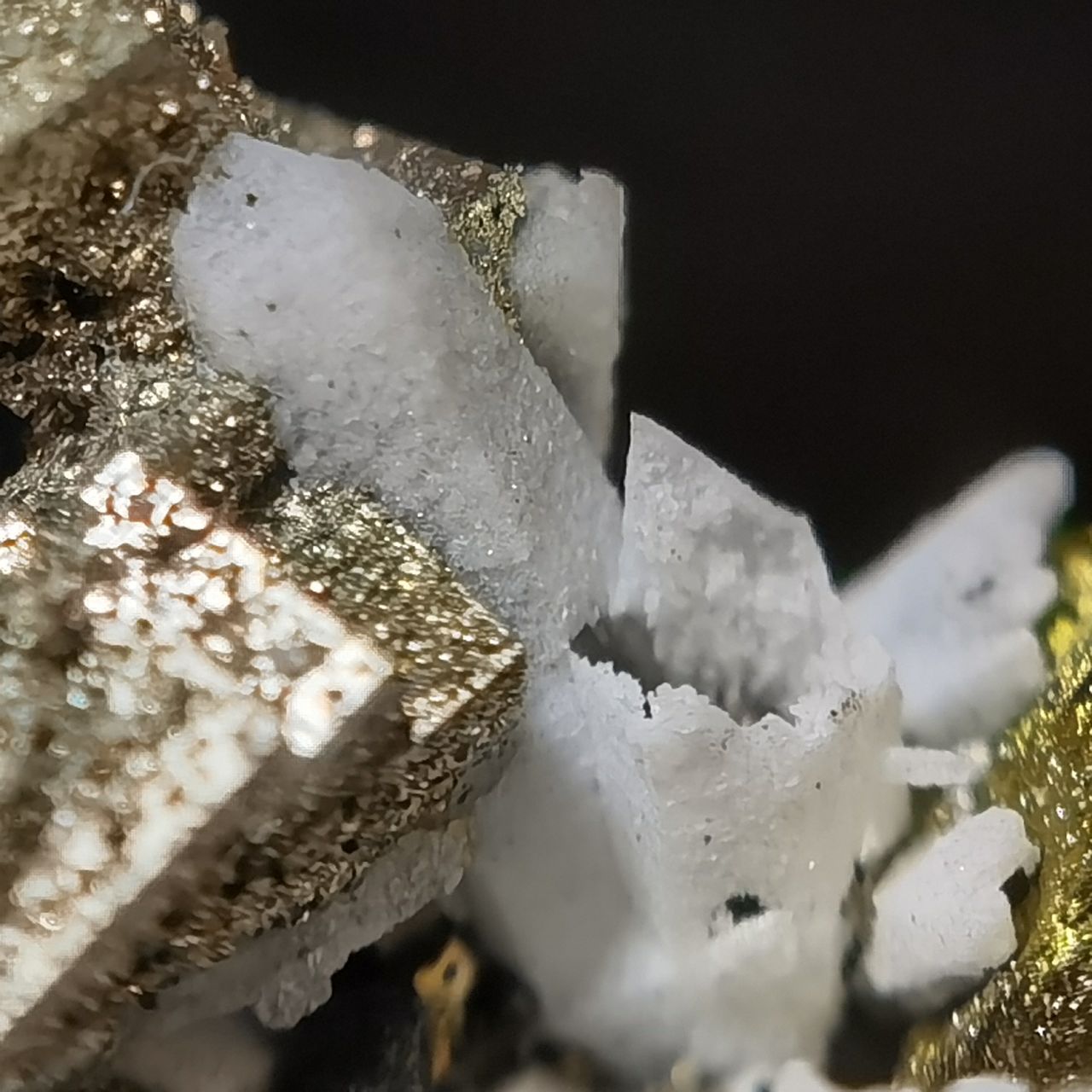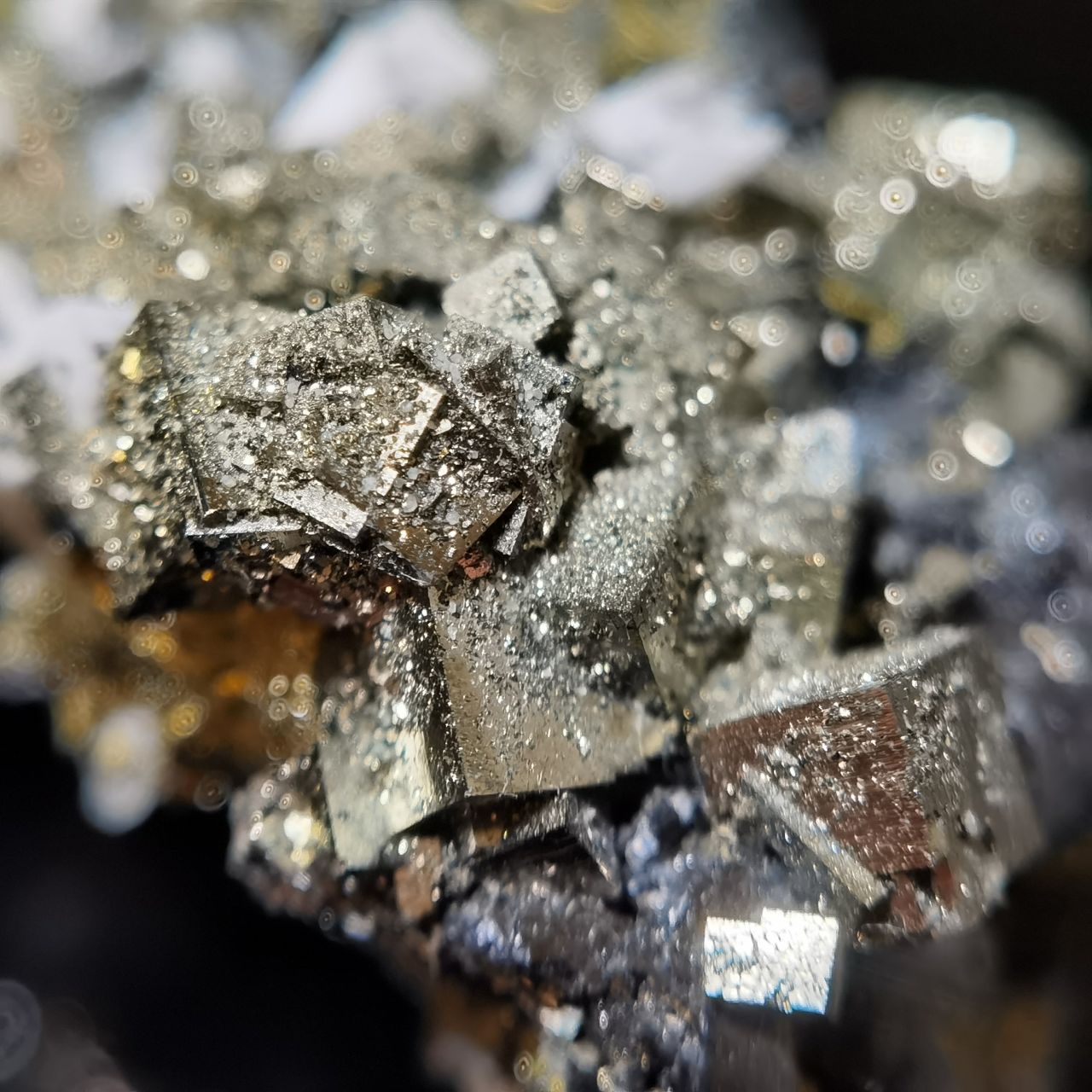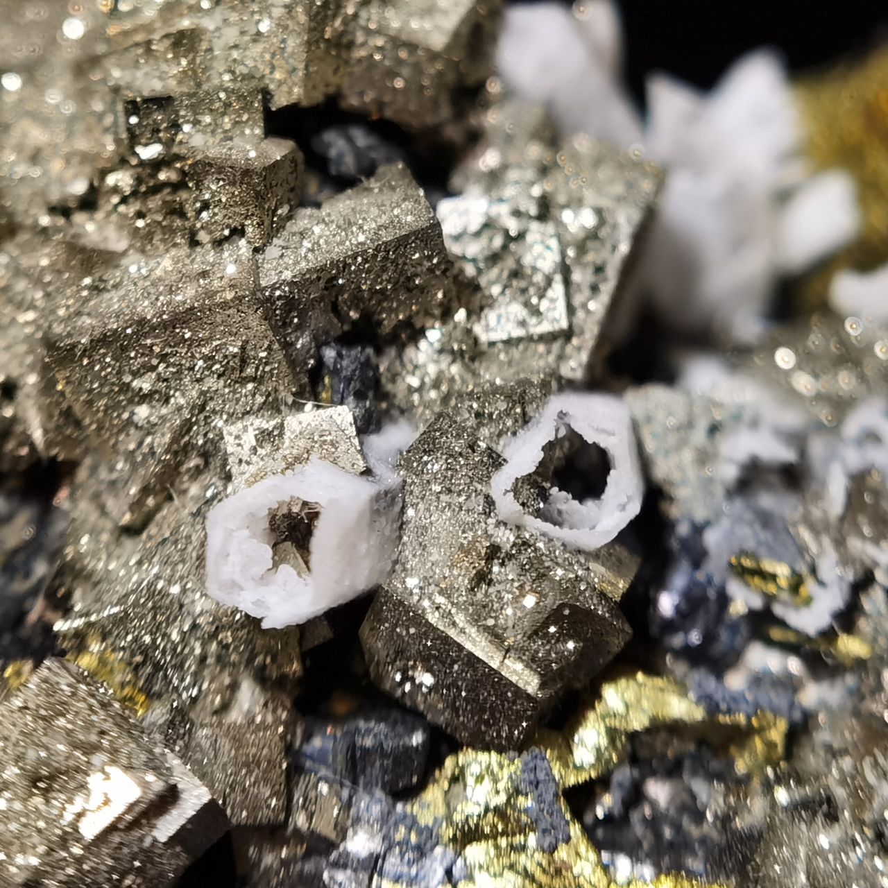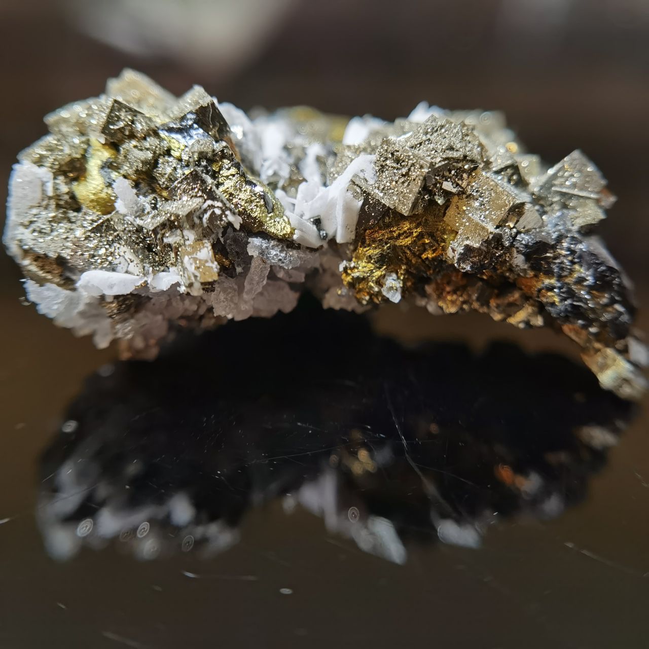 黃鐵礦閃閃發亮但表面坑坑窪窪的實際上是表面的小結晶生長丘以及蝕坑,不清楚是否與矽卡巖礦牀相關,大家如果想看黃鐵礦我這裏也有更好的。黃銅和閃鋅沒啥好介紹的,寫這塊標本主要原因是觀察到了非常奇特的現象