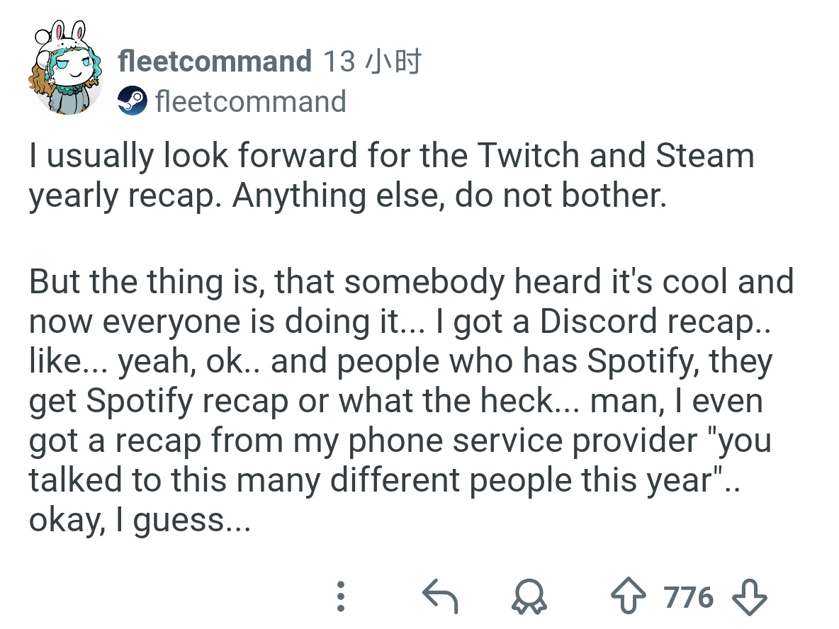 我一般也就盼着Twitch和Steam的年度回顾,别的玩意儿,谁稀罕啊!