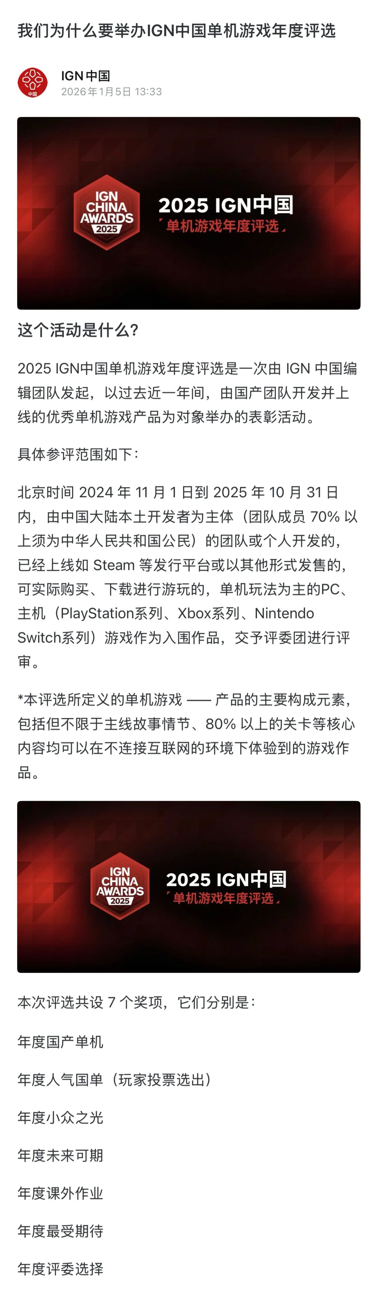 今日,ign中国官方发文即将开展《中国单机年度评选活动!