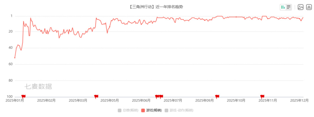 2025年7月,《三角洲行动》首次进入全球手游收入榜,随后便长期稳居榜单TOP17以内,11月甚至冲上榜单TOP10。2025年下半年,该游戏在中国App Store游戏畅销榜中的排名基本稳定在TOP5。
