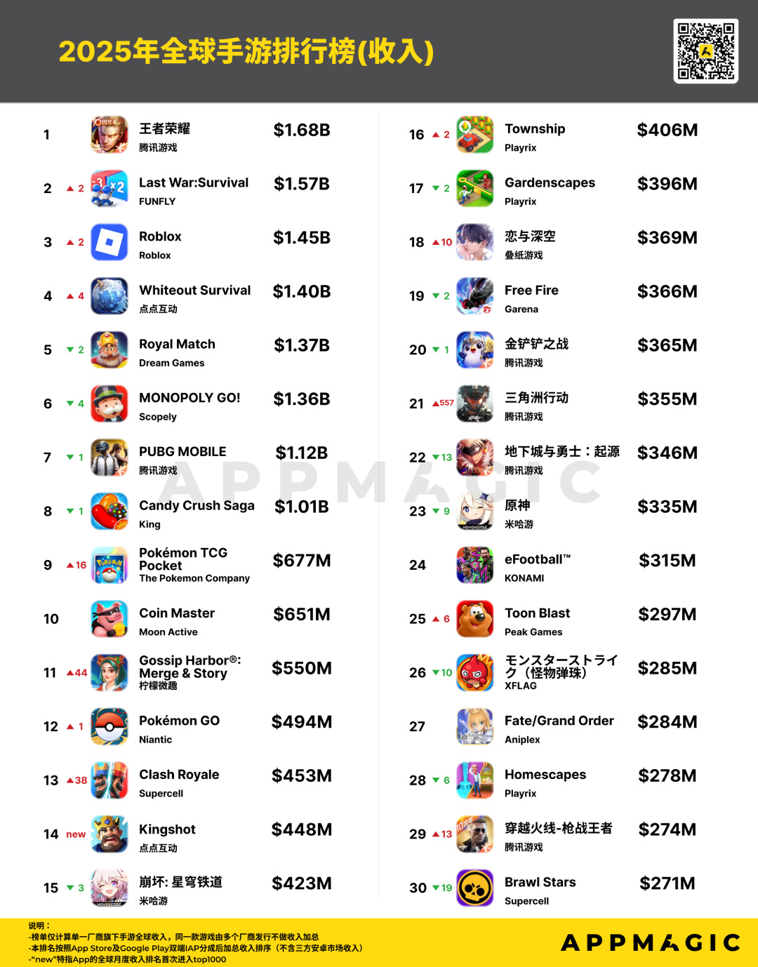 《Gossip Harbor》《Clash Royale》《三角洲行动》《Toon Blast》《穿越火线-枪战王者》以及榜单上唯一的2025年新作《Kingshot》(奔奔王国)全年收入表现亮眼,均首次进入年度收入TOP30。