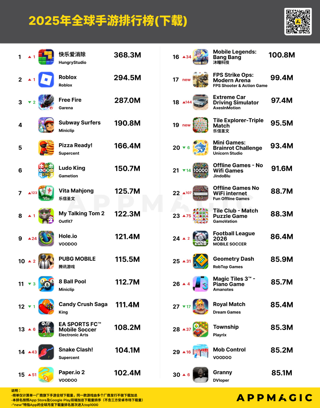 此外,AppMagic还公布了2025年全球手游下载Top30。