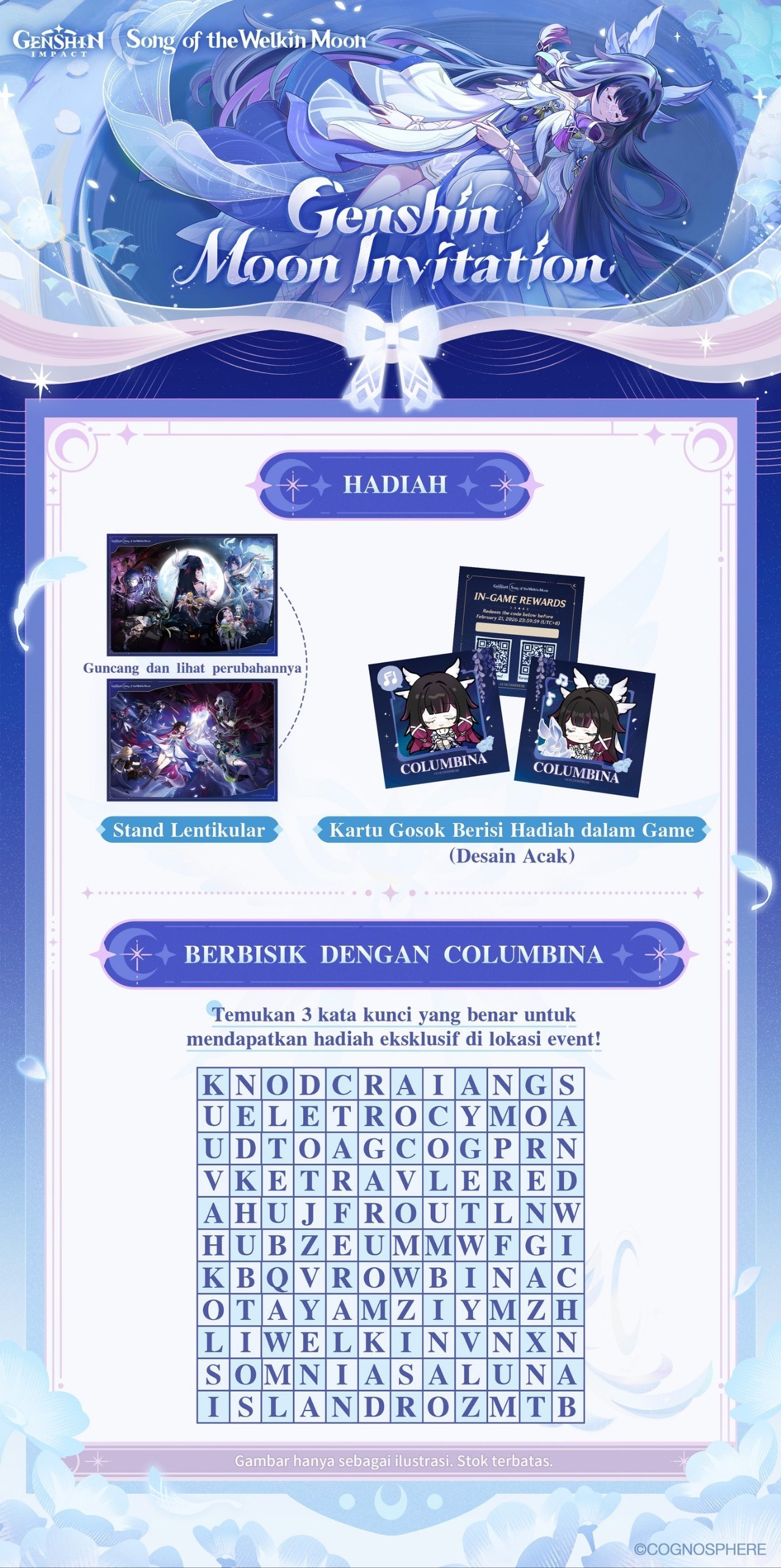 3. 少女与秘密:向工作人员说出密语“月光联系着你我,不论日夜”(备用密语:《原神》空月之歌,去月的归处),可领取「哥伦比娅主题光栅卡」1张。
