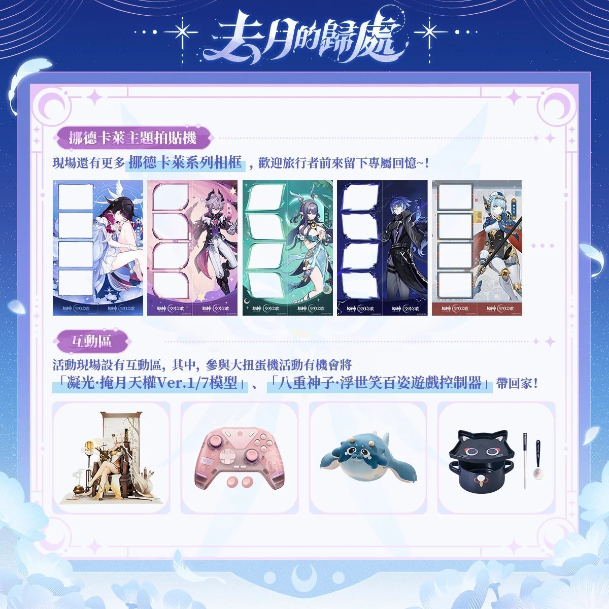 5. 互动区:设有拍贴机(含挪德卡莱主题相框)和扭蛋机,扭蛋机可抽取「凝光·掩月天权Ver.1/7模型」「八重神子·浮世笑百姿游戏控制器」等豪华奖品。