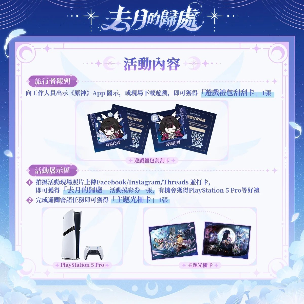 2. 银月之庭体验区:展示「银月之庭」艺术装置,拍摄现场照片上传Facebook/Instagram/Threads并打卡,可获得「去月的归处」活动抽奖券1张,有机会赢取PlayStation 5 Pro等礼品。