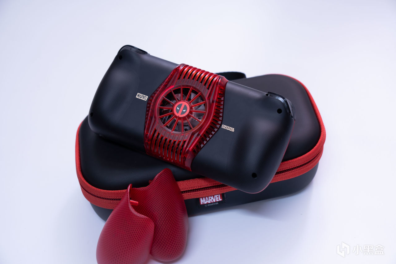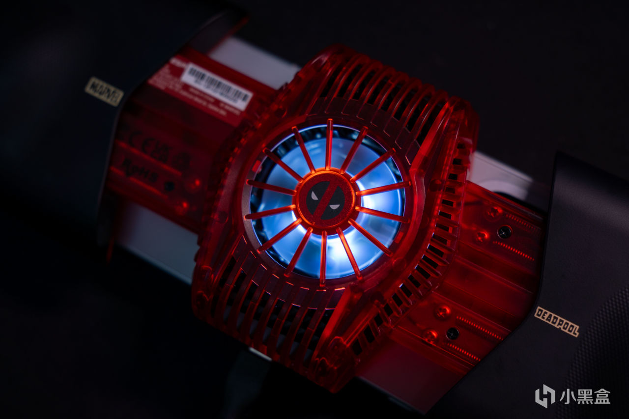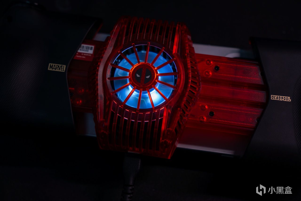 来到背面,风扇中心的地方刚好放上死侍经典的头像,空白处写着漫威与死侍的英文,这英文看上去确实是有点感觉哦。