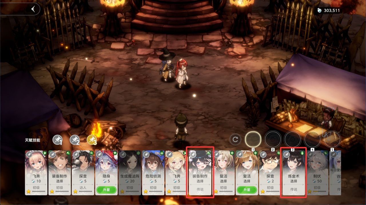 经验满了之后在角色界面找到这个角色,点击红框中的图标,然后升级他的技能,再继续制作绿装及蓝装提升熟练度,直到将技能升满