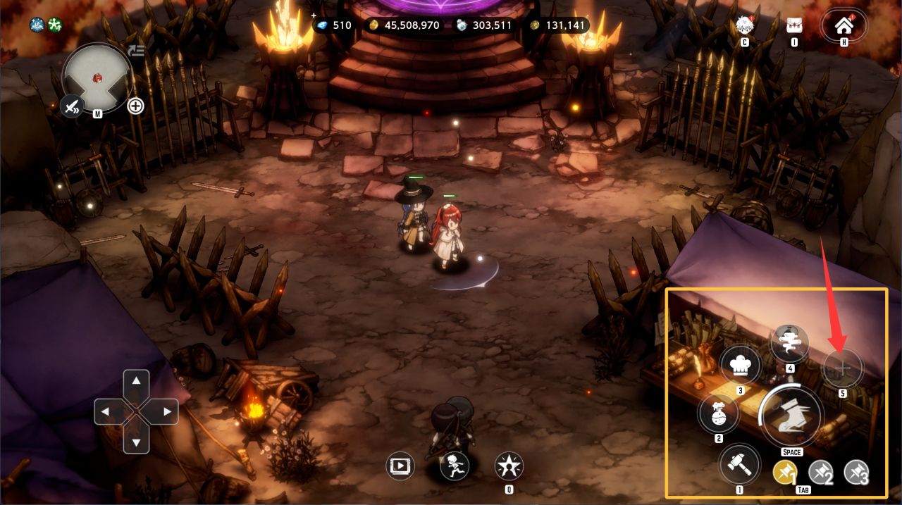 首先在地图场景中点击技能轮盘上的加号,然后找到红框中的两个角色,点击他们左上角的图钉图标,将他们的技能固定到技能轮盘中