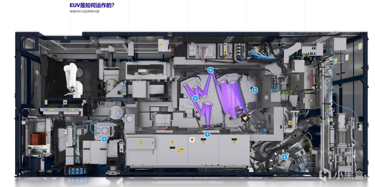 然后把晶圆放进光刻机,这也是整个过程中最重要的一步,通过紫外光将芯片设计图精准刻到覆盖光刻胶的晶圆表面,实现纳米级电路图形的雕刻,荷兰的 ASML 在高端光刻机领域完全垄断。