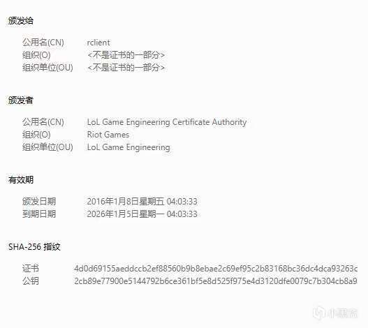 英雄联盟 / Riot Client 自己用来做加密通信的 TLS/SSL(X.509)安全证书过期了,可以看到2016年1月8日星期五的 4点3分33秒生成的证书,十年后刚好是 2026年1月5日4点3分33秒。它负责让客户端和(包括本机与平台组件、以及远端服务的)接口通信时走 HTTPS、做身份校验;一旦过期,校验失败,客户端就会拒绝继续连接,于是出现“无法登录 / 会话错误 / 客户端进不去”等现象。