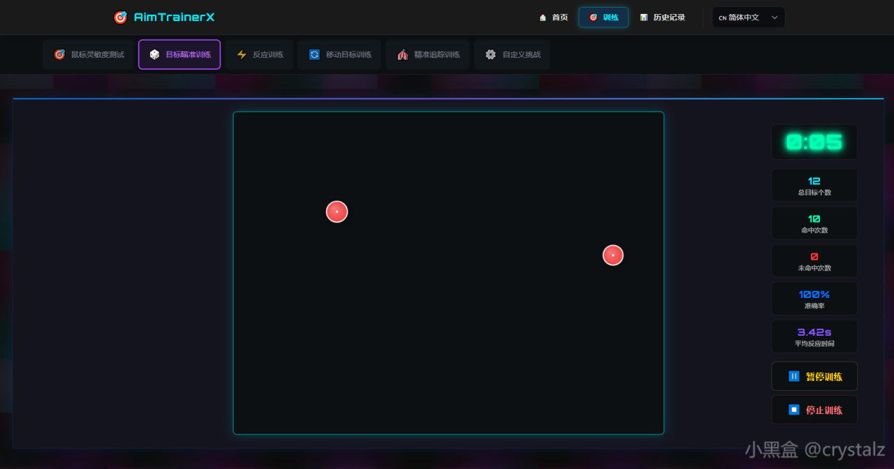 提供鼠标灵敏度测试、精准度训练、反应速度、移动目标、追踪训练、自定义挑战等多种模式,提升你的反应速度和精准度。