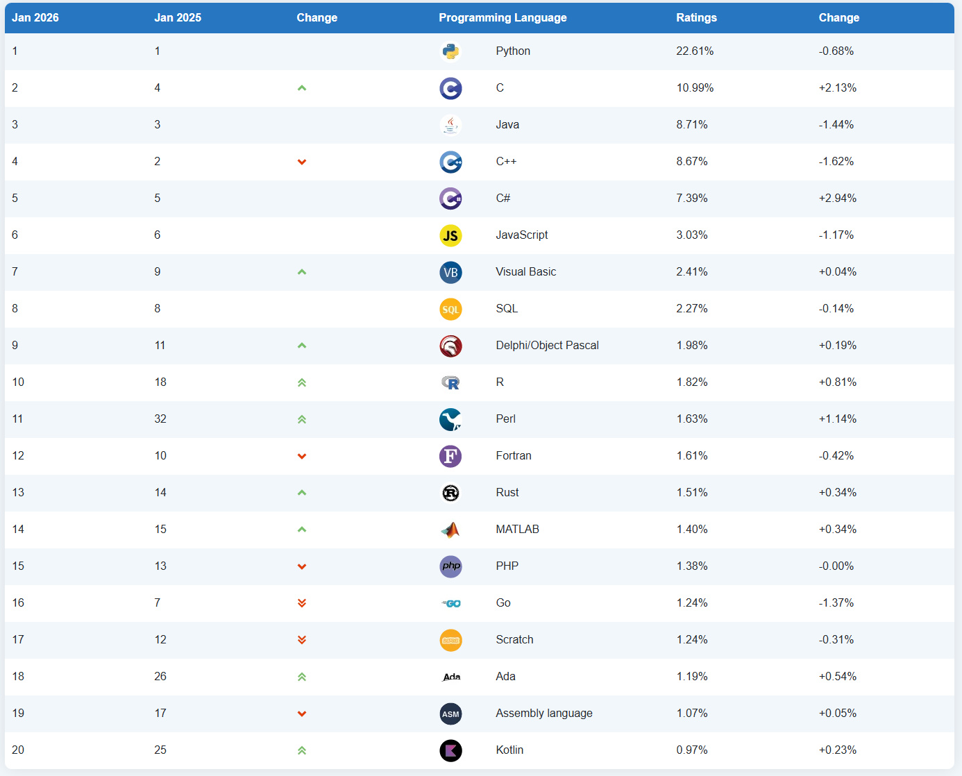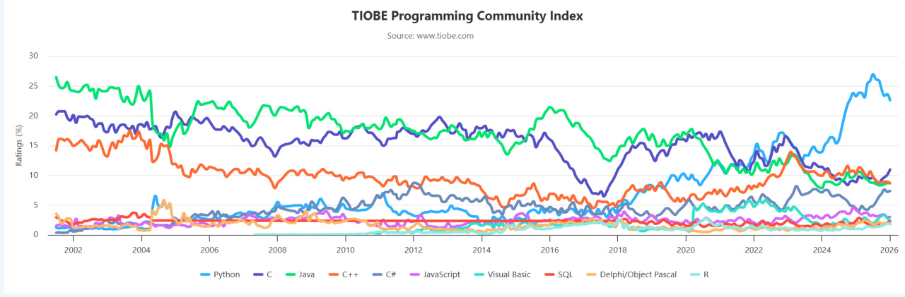 TIOBE 公布的数据显示,C# 凭借 2.94% 的年度最高涨幅,继 2023 年后再次获评“2025 年度编程语言”。目前 C# 位列榜单第 5 位。在最新排名中,Python 以 22.61% 的份额稳居第一。C 语言超越 C++ 升至第 2 位,J**a 与 C++ 分列第 3、4 位。此外,R 语言重返前 10,Perl 升至第 11 位;Go 语言跌出前 10 位列第 16,Ruby 则跌至第 27 位。该指数主要通过全球工程师数量、课程及主流搜索引擎数据衡量编程语言普及度。