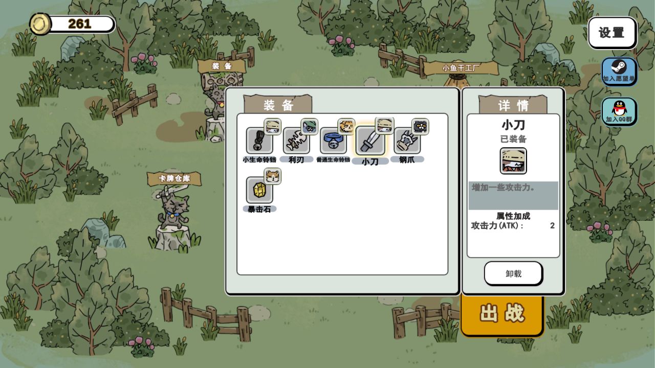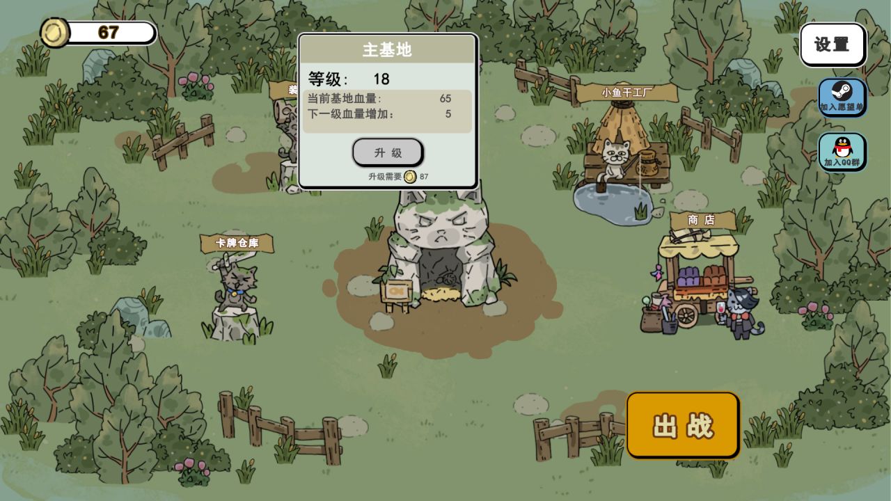 如果在战斗中磕磕绊绊,那么局外成长就能够轻松的帮助你顺利通关,升级主基地可以提升基地血量,升级小鱼干工厂能够提升小鱼干产出的速度,升级小鱼干仓库可以增加开局拥有的鱼干数量。