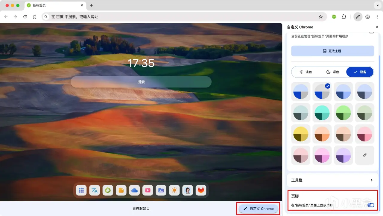 如果你的Chrome浏览器更新到最新版本后,新标签页出现了如图所示的底部大白边,那么点击白边右侧的「自定义Chrome」按钮,关闭「页脚」即可。 这是Chrome浏览器139.0版本新增的神秘新特性: