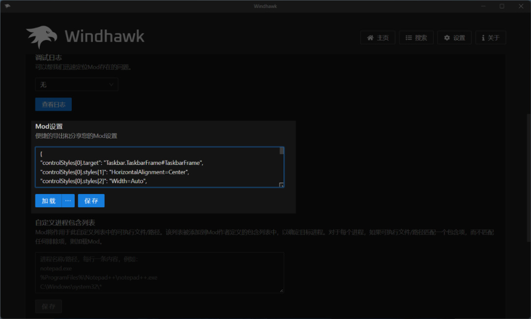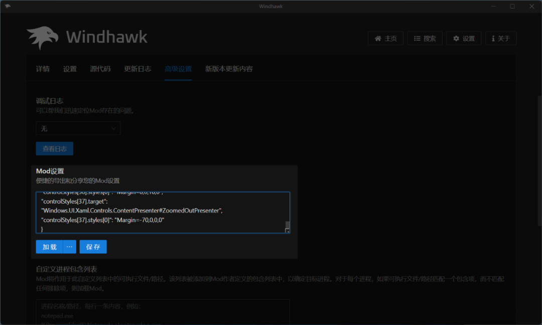 不過這裏我們是需要模仿 Win12 的任務欄設計,所以需要手動導入美化配置文件。點擊高級設置 - Mod 設置,粘貼提供的配置代碼,然後點擊保存。