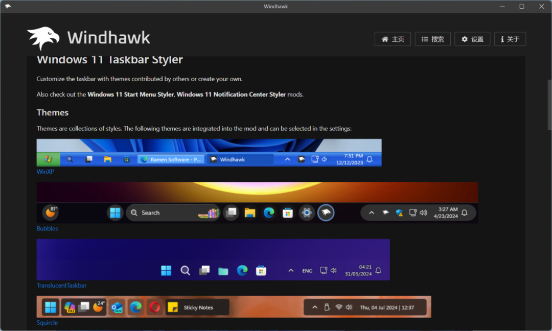 美化任務欄:打開運行「Windhawk」模塊市場,安裝上 Windows 11 Taskbar Styler 模塊,可以看到默認提供了一些任務欄美化樣式可以使用。