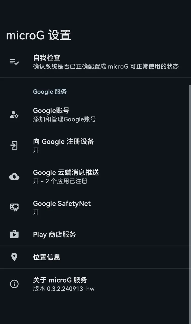 接着进入「microG」的设置界面,会有一个自动检查,确保所有选项都勾上,这时候就能正常使用了。