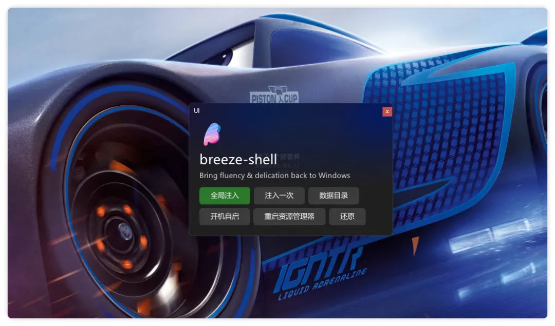 下載「Breeze」好後解壓,直接運行 breeze.exe 程序,提供了全局注入、注入一次、開機自啓、重啓管理器、還原。建議先注入一次體驗下,覺得不錯那就再選擇全局注入,並設置開機自啓。