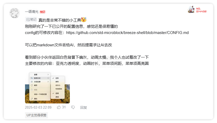不過這個經典菜單所有東西比較雜亂堆在一起,並且也不支持亞克力磨砂透明效果。現在有大佬爲這個經典右鍵菜單製作了一款美化加強工具「Breeze」將不常用的菜單都被歸在了二級菜單內,並且還支持動畫效果和拓展。具體效果如下:
