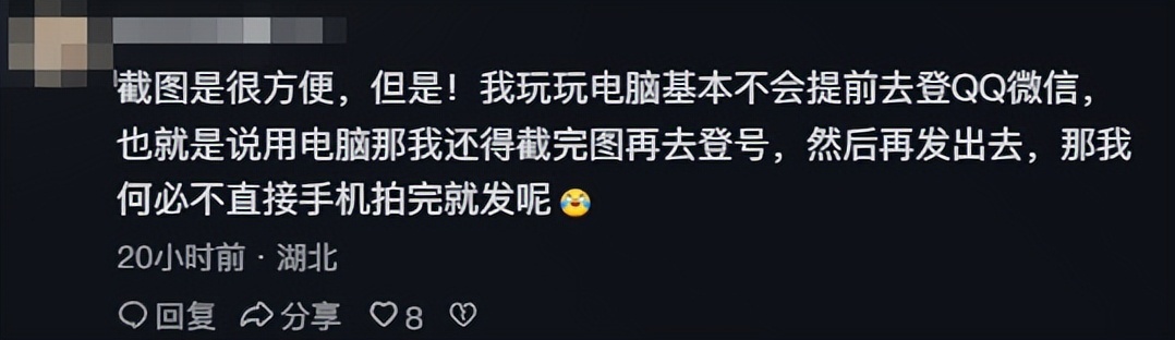 退一步说,万一有人想在电脑上截图发朋友圈,结果发现没登微信,还得再用手机点个确认登录,那确实还不如直接拍屏幕了。再比如各种主机上的截图,要么得开热点分享,要么得进APP等同步,再早一点的掌机甚至还得拔内存卡、翻读卡器,一套操作下来反倒有些扫兴。