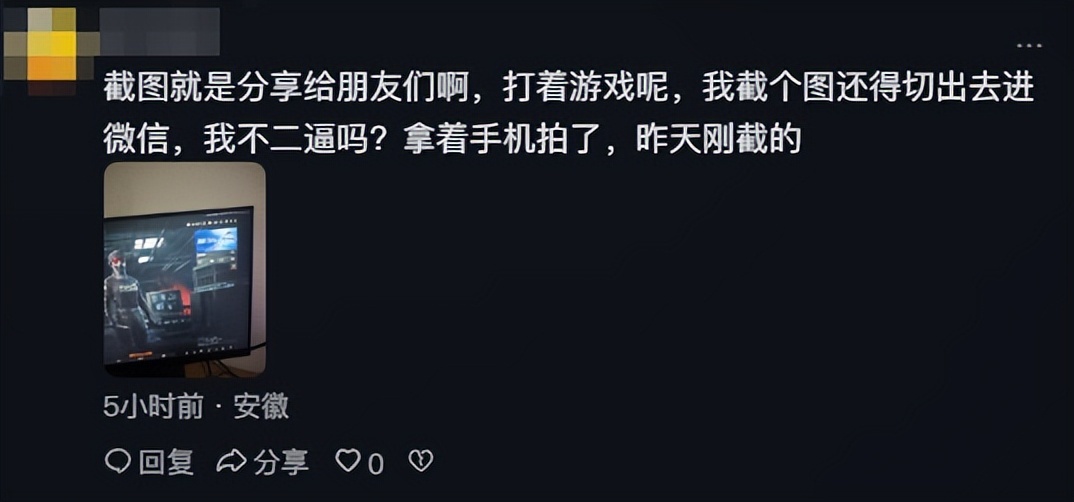 这种想法不无道理,伴随移动网络的发展,大部分社交行为的主力,其实都转移到了移动端。不管是发个朋友圈,还是进个游戏社区,玩家基数最大的必然会是那几个在手机上最火的软件。更重要的是,对大部分人而言,手机约等于一个外置器官,比起冒着打破沉浸感的风险,操作电脑截图然后传到手机上,似乎直接用手机拍照更加符合直觉。