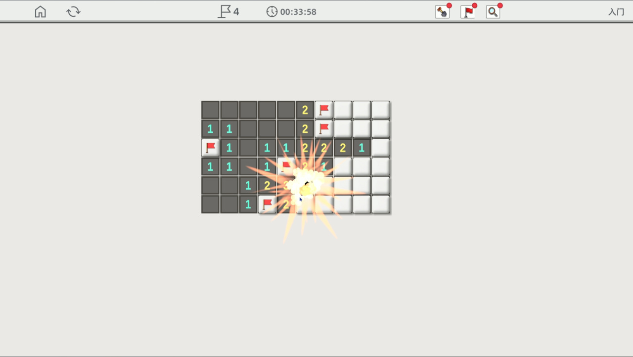 它的主要创意在于——在原扫雷玩法的基础上,玩家需要主动地寻找地雷并引爆,点击到数字格反而会丧失血量,这下玩家胜利的条件变成了引爆全部的地雷。