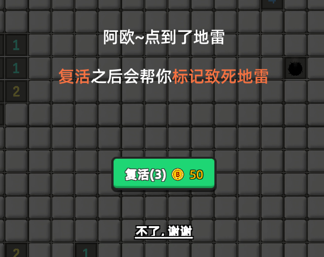 当经典模式点到地雷,或大雷模式失去5格血量,游戏就会失败,但是可以通过消耗金币进行复活,复活后会自动帮你标记踩到的致死地雷(经典模式),或帮你随机引爆一颗还没引爆的地雷(大雷模式)