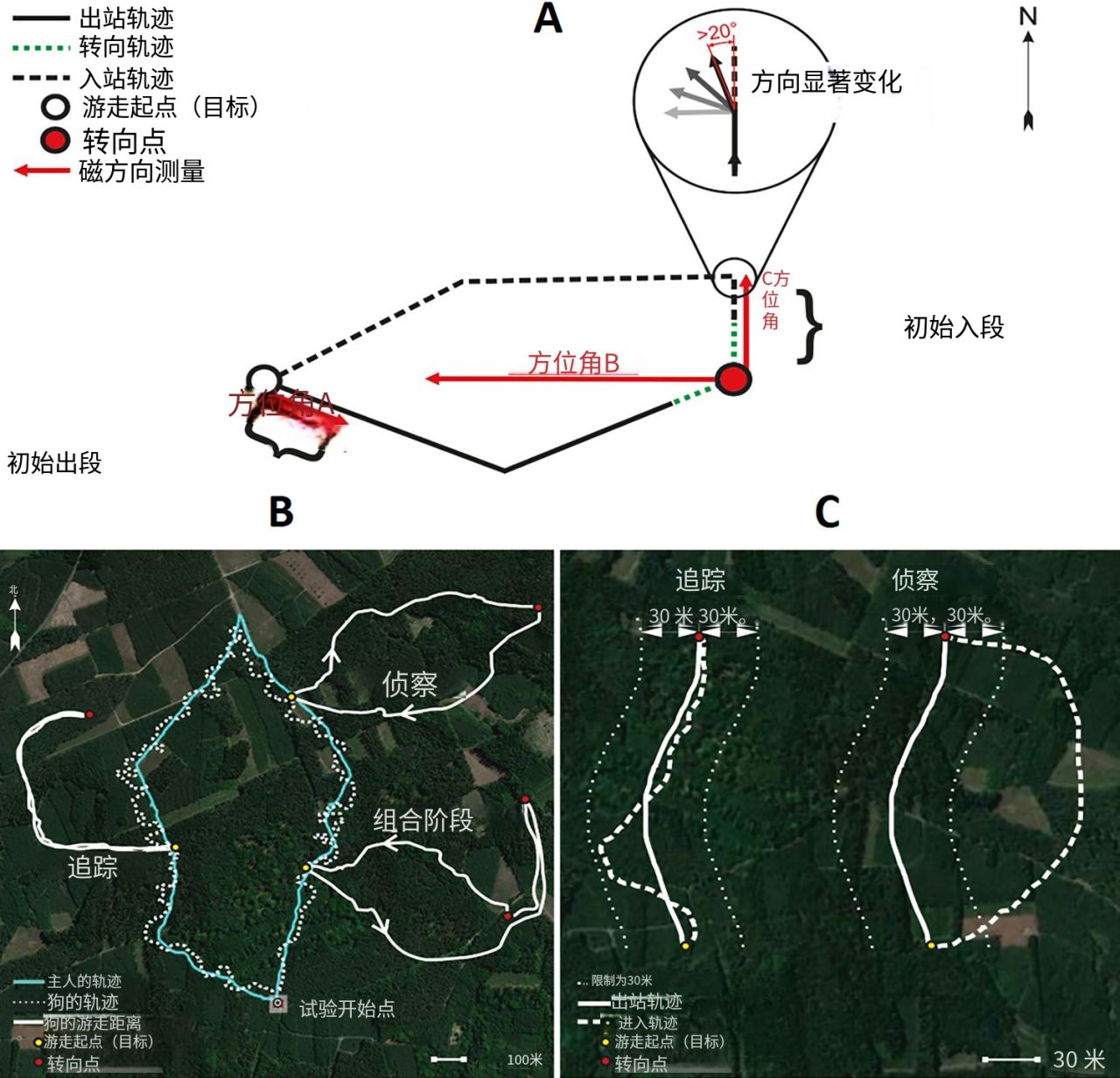 另外 30% 的犬類採取了另一種策略。這些犬隻採用了一種偵察策略,即無論訓練員身處何處,它們都會沿着森林的南北軸線跑一小段距離,從而開闢一條全新的路線。
