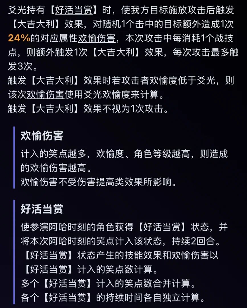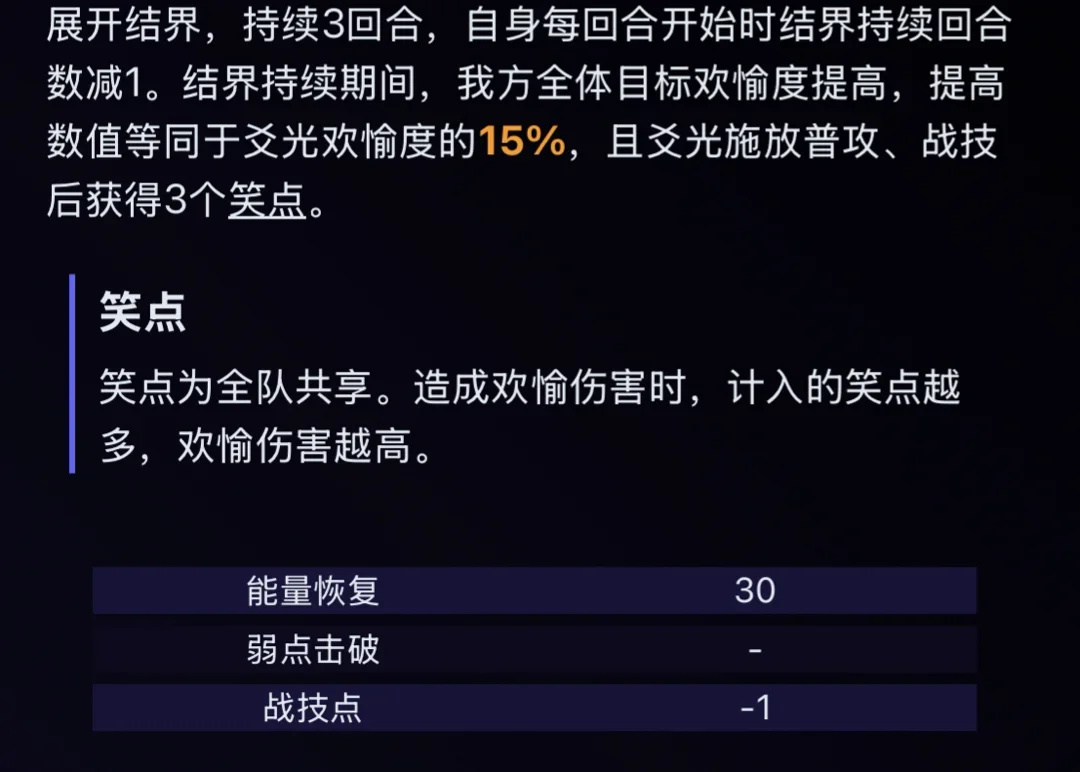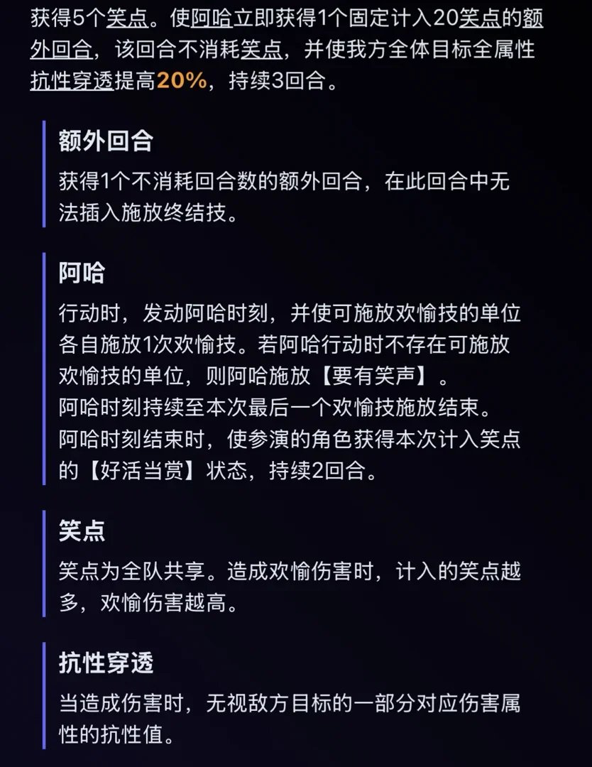 E1:终结技触发的阿哈的额外回合固定计入笑点数提高至30个,且该回合内欢愉技造成的伤害为原伤害的140%。