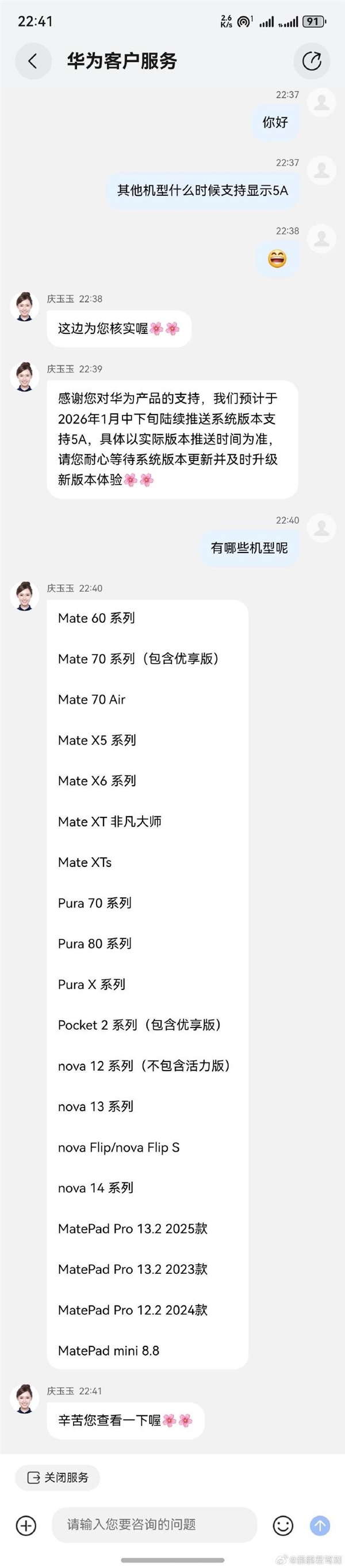 本月OTA 5A的具体机型包括Mate 60系列、Mate 70系列(含优享版)、Mate 70 Air、Mate X5系列、Mate X6系列、Mate XT 非凡大师、Mate XTs、Pura 70系列、Pura 80系列、Pura X系列、Pocket 2系列(含优享版)、nova 12系列(不含活力版)、nova 13系列、nova Flip/nova Flip S、nova 14系列。
