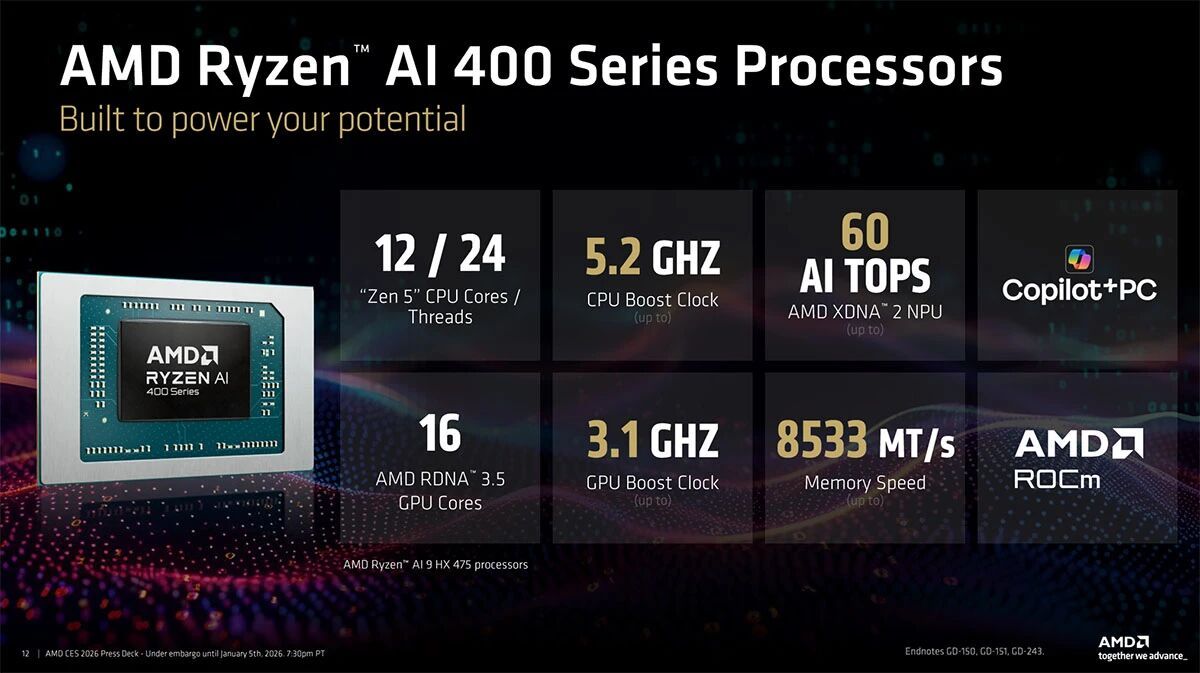 AMD 锐龙 AI 400 系列是本次 CES 2026 面向 AI PC 市场的核心新品,代号 “Gorgon Point”,相比上代锐龙 AI 300 系列(Strix Point)在 CPU/GPU 频率、内存速度与 NPU 算力上全面提升,同时首次覆盖桌面平台,成为市场首款支持插槽式设计的 Copilot + 台式机处理器,目标推动 2026 年 “NPU 赋能 AI PC 成为主流”。