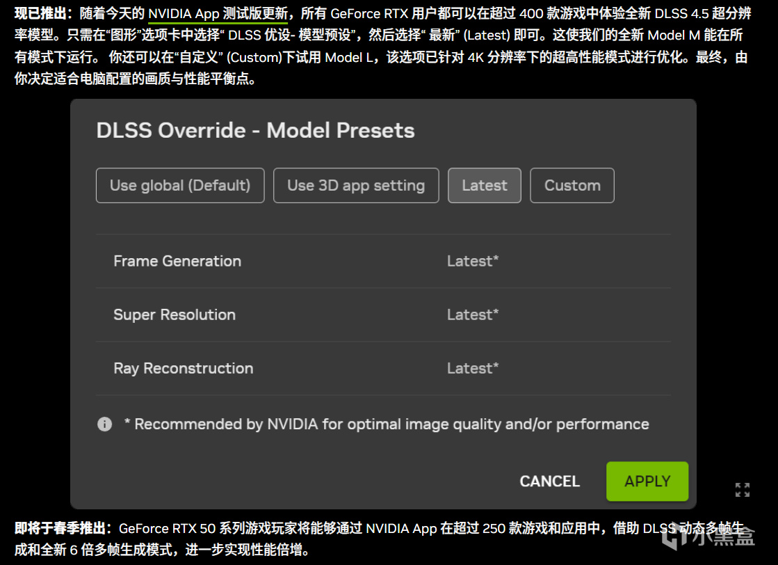 如需为每项 DLSS 技术应用最新、最出色的模型,只需点击“最新” (Latest),然后点击“应用” (Apply)。