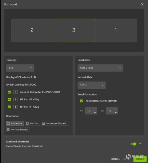在“系统 > 显示器”中,所有剩余的 NVIDIA Surround 设置均已从 NVIDIA 控制面板移植过来,并增加了边框校正和热键选项。