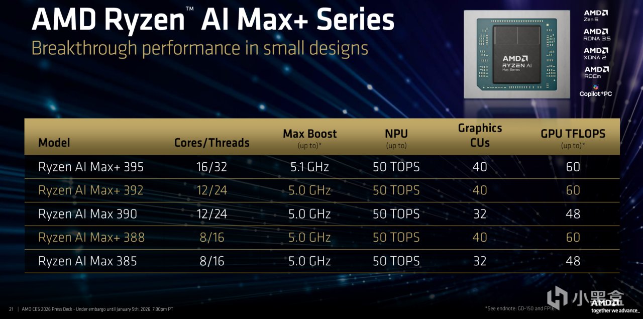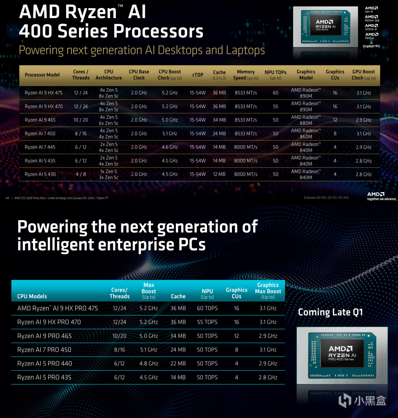 移动端处理器方面——全新AMD Ryzen AI 400系列处理器集体亮相,属于Zen 5架构小改款,在最大睿频、内存频率支持、NPU TOPs和GPU频率四大方面均有提升。