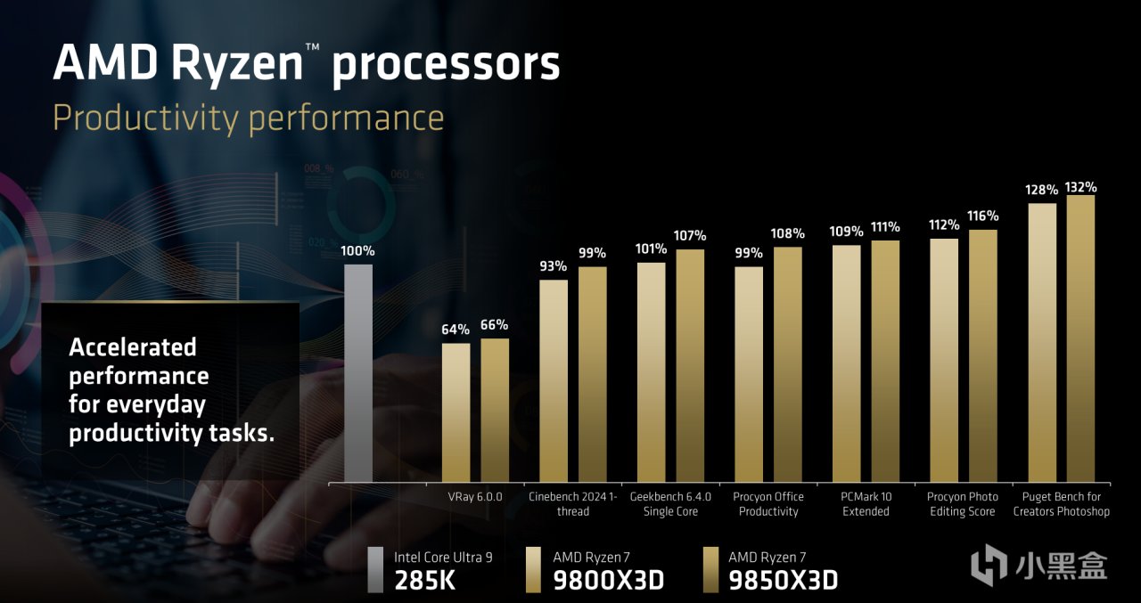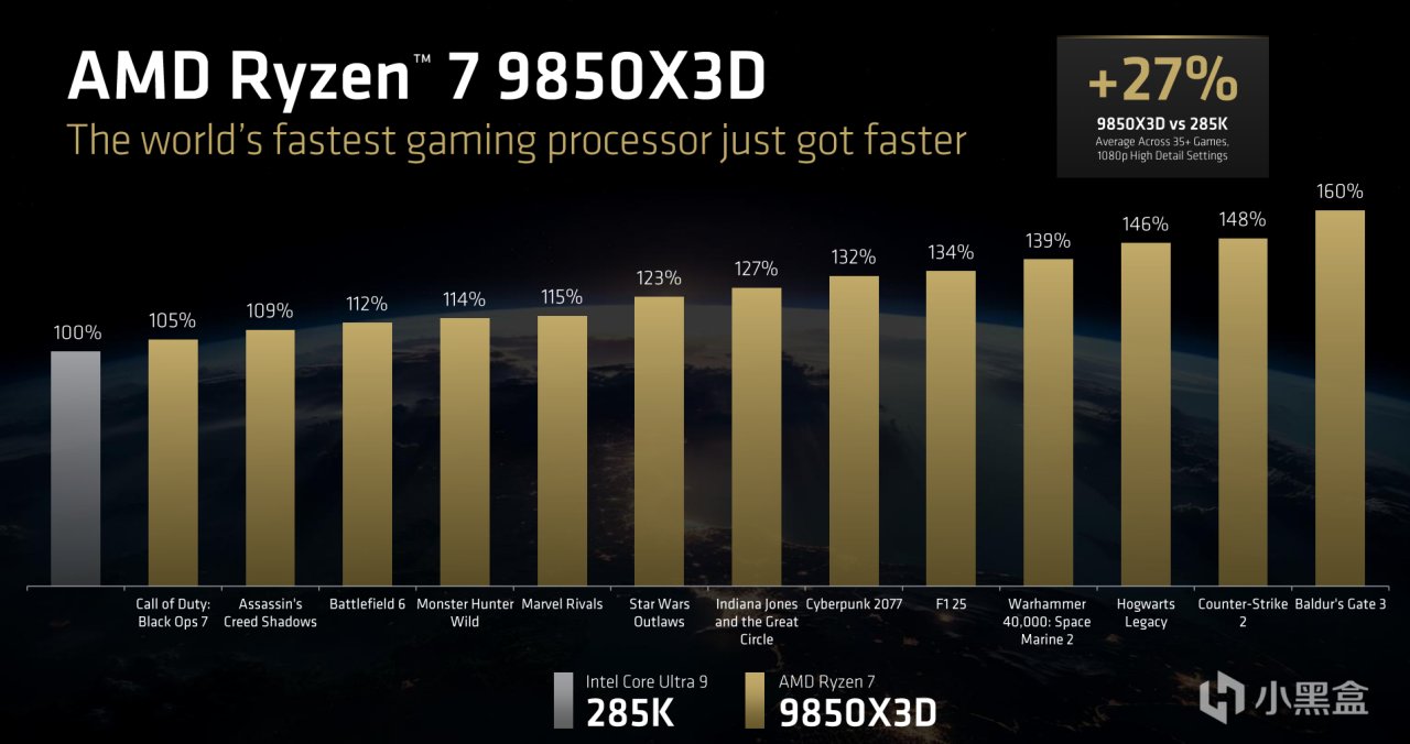 根据官方相关测试表明,锐龙7 9850X3D在35款+游戏1080P高画质测试项目中,平均性能可领先Intel Core Ultra 9 285K达到27%幅度,最优势的项目甚至达到60%夸张幅度,大多数游戏都超过20%幅度。