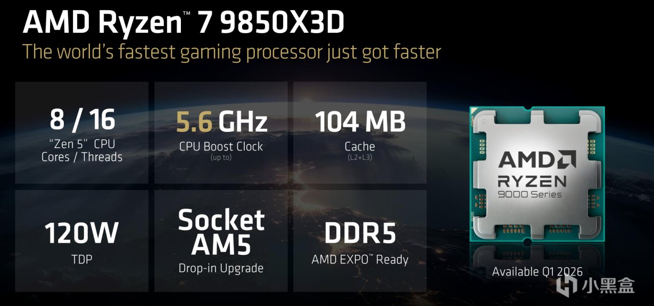 桌面端处理器方面,AMD继续迎合游戏玩家的需求,延续锐龙7 9800X3D的生命力——正式推出锐龙7 9850X3D,8核16线程设计,L2+L3缓存达到104MB,加速频率从原来的5.2GHz大幅提升至5.6GHz,TDP则维持120W不变,凭借频率提升进一步巩固最强游戏CPU的地位,锐龙7 9850X3D将于2026年第一季度发售。