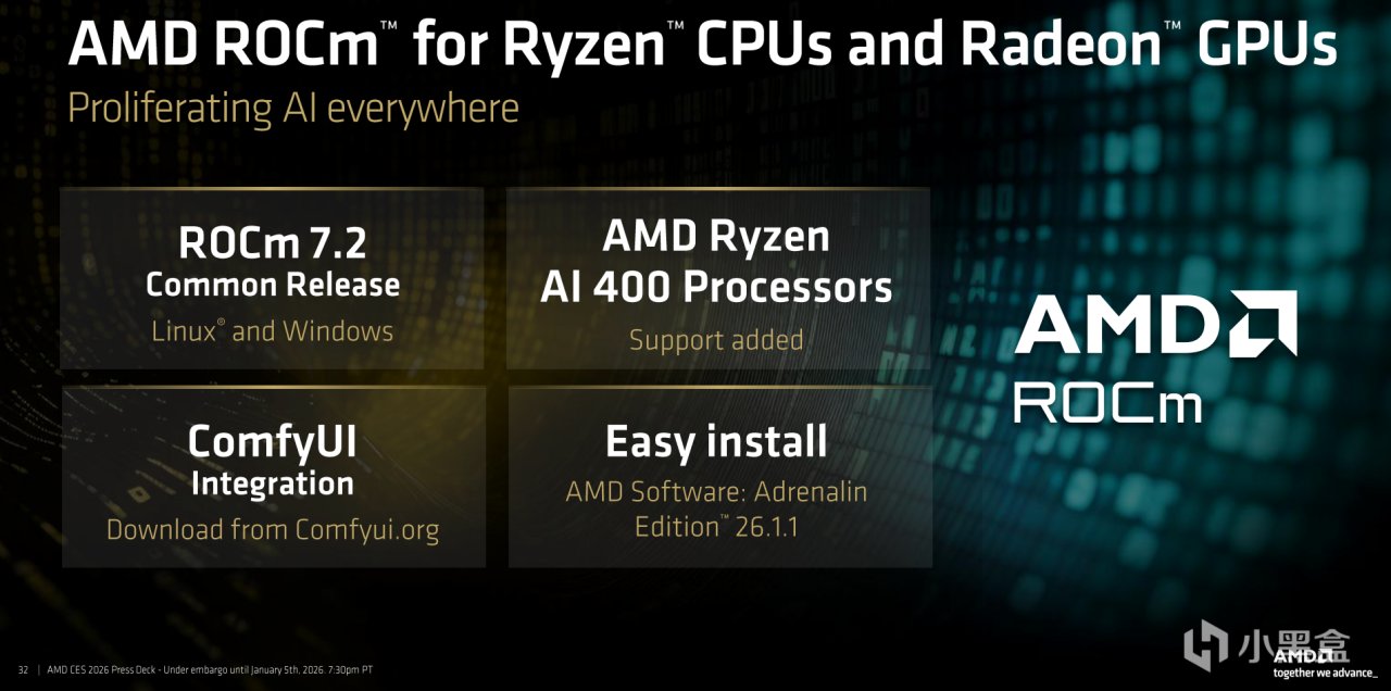 AMD ROCm软件栈最新版本也即将迭代到7.2,通过AMD Software:Adrenalin Edition 26.1.1驱动可在Windows系统中直接获得支持,AI性能提升更明显,并兼容更多Ryzen和Radoen产品,未来ROCm将持续为AMD发力。