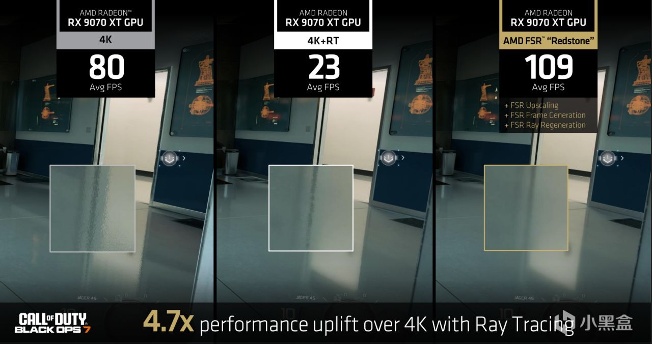 在《使命召唤:黑色行动7》官方测试中,就以目前最受玩家欢迎的RX 9070 XT显卡为例,4K分辨率平均帧数已经达到80fps,开启光线追踪降到平均23fps,借助FSR Redstone技术中的FSR超分辨率提升和FSR帧生成,帧率大幅提升至109fps,相比开启前提升4.7倍,还能利用FSR光线再生修复了光追画面中的噪点和细节。