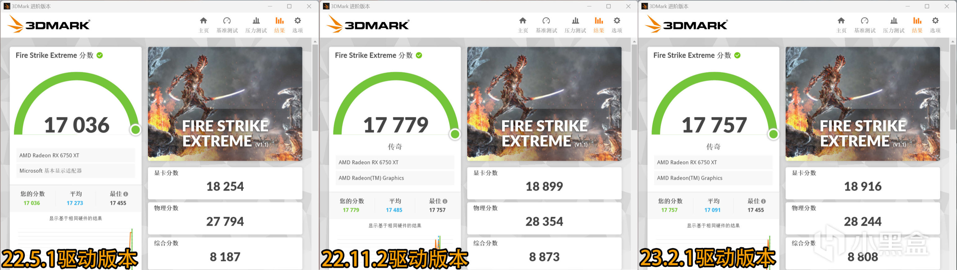 Fire Strike Extreme 22.5.1版本顯卡跑分爲18254,22.11.2版本顯卡跑分爲18899,23.2.1版本顯卡跑分爲18916