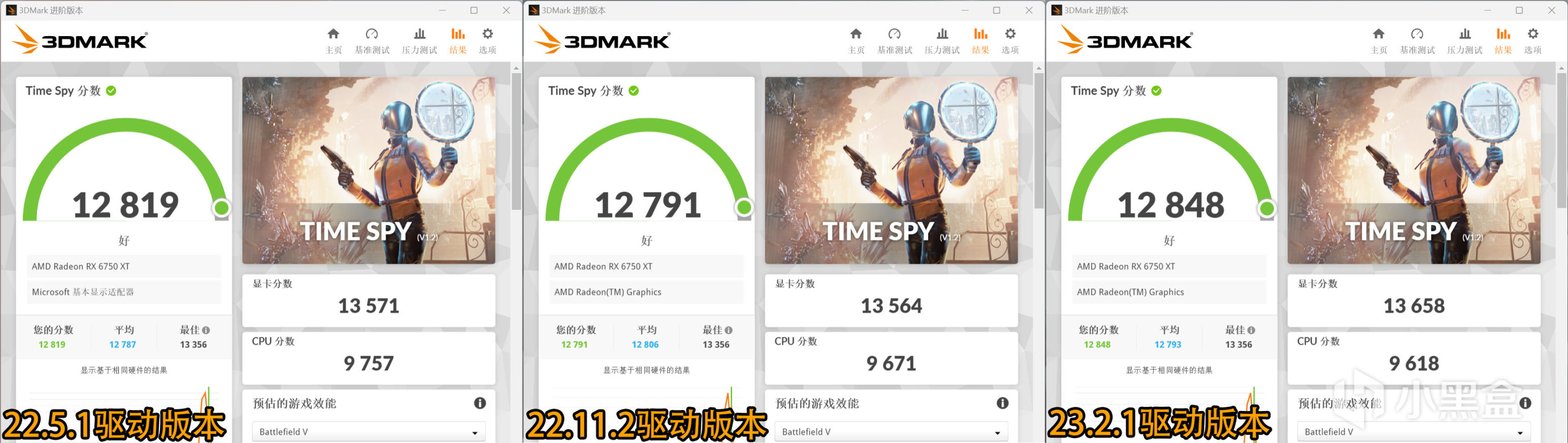 Time Spy 22.5.1版本顯卡跑分爲13571,22.11.2版本顯卡跑分爲13564,23.2.1版本顯卡跑分爲13658