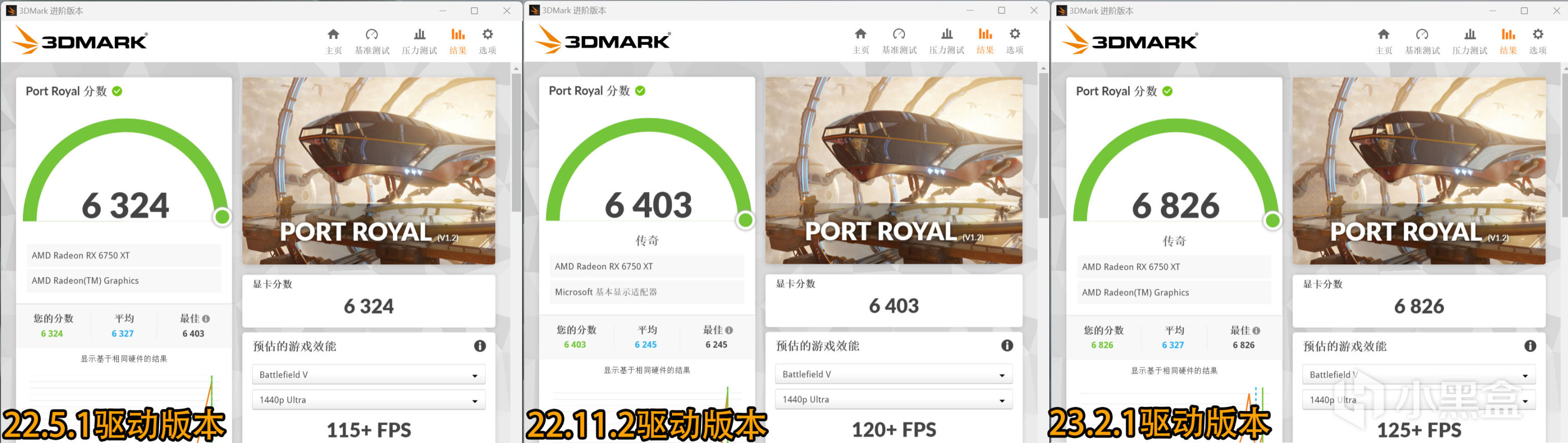 Port Royal 22.5.1版本顯卡跑分爲6324,22.11.2版本顯卡跑分爲6403,23.2.1版本顯卡跑分爲6826