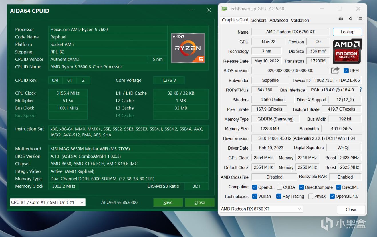 本次用來搭配RX 6750 XT的是Ryzen 5 7600智酷版,畢竟他們倆定位挺相似的,其基礎頻率爲3.8Ghz,Boost最高頻率爲5.1Ghz,功耗比Ryzen 5 7600X更低,性能差距甚小尤其是遊戲方面,而玩家又可以通過簡單的超頻手段輕鬆追平。