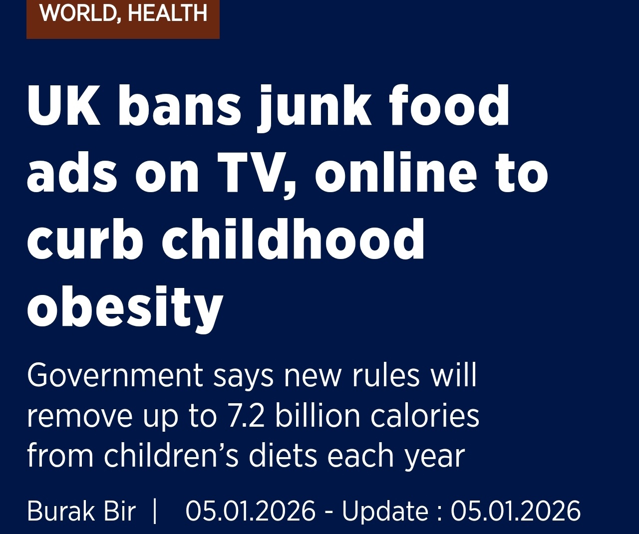 英国于今日(2026年1月5日)正式实施一项在全国范围内具有里程碑意义的禁令:禁止在电视和网络平台投放针对儿童的垃圾食品广告。这一被政府称为“世界领先”的举措,旨在遏制日益严重的儿童肥胖问题。