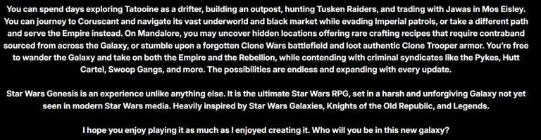 《星球大战:创世纪(Star Wars: Genesis)》是一款100GB的MOD,它彻底改造了原版《星空》,将其变成了一款粉丝梦寐以求的完整开放世界星球大战体验。