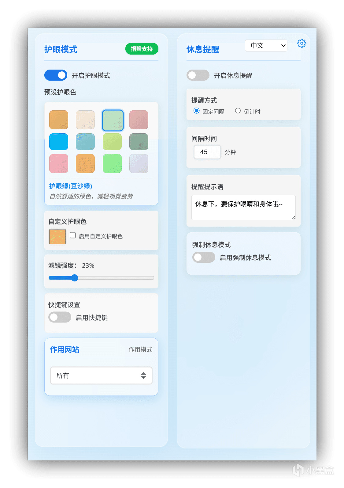 精准网站控制:可选择在所有网站或指定网站应用护眼模式