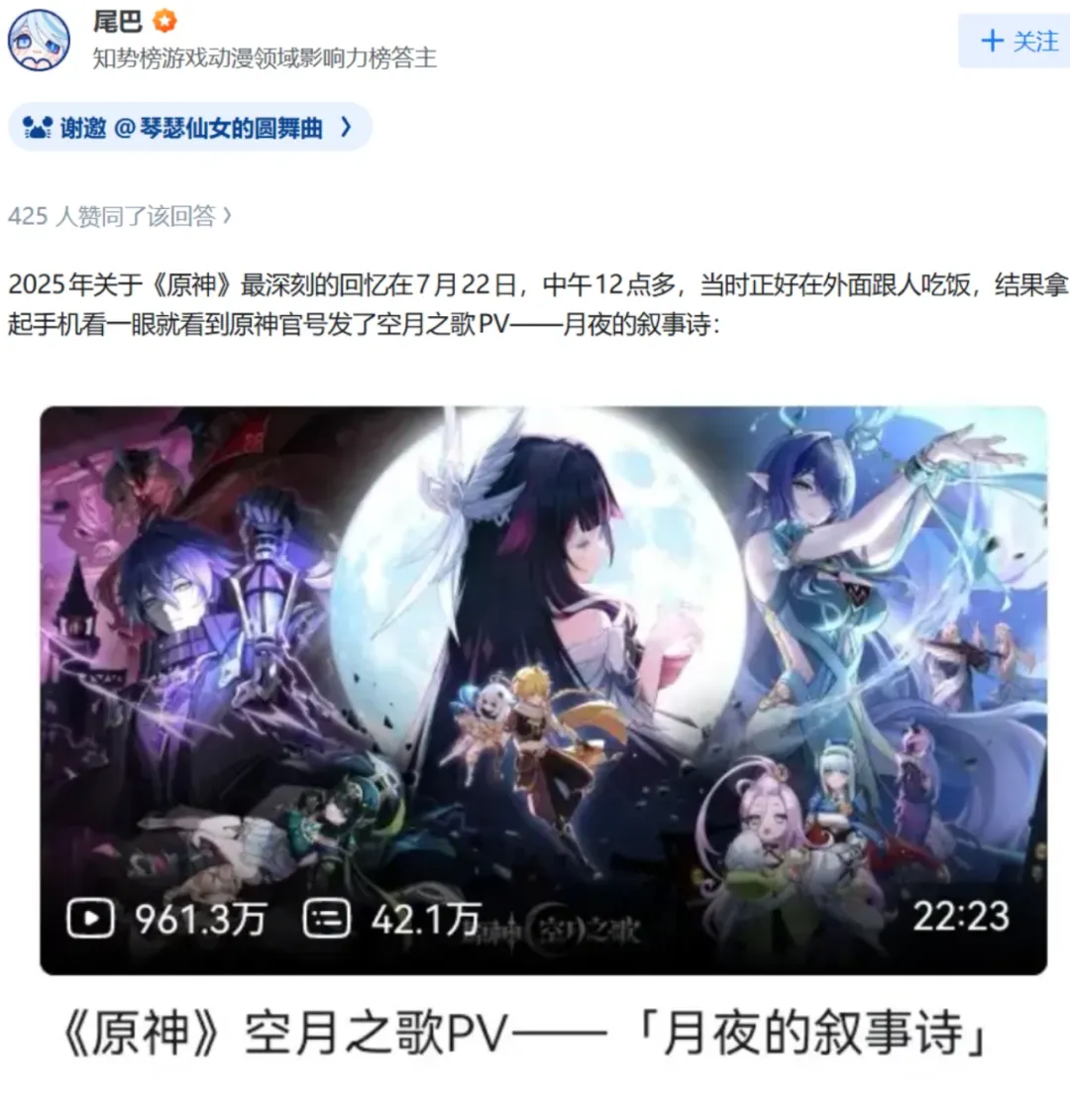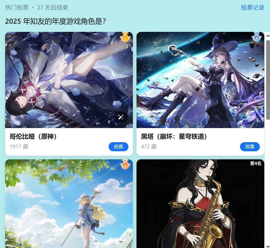 投票榜单也验证了《原神》挪德卡莱版本任务塑造的成功,月之少女哥伦比娅以1917票,压倒性地夺得了“2025年知乎年度游戏角色”。